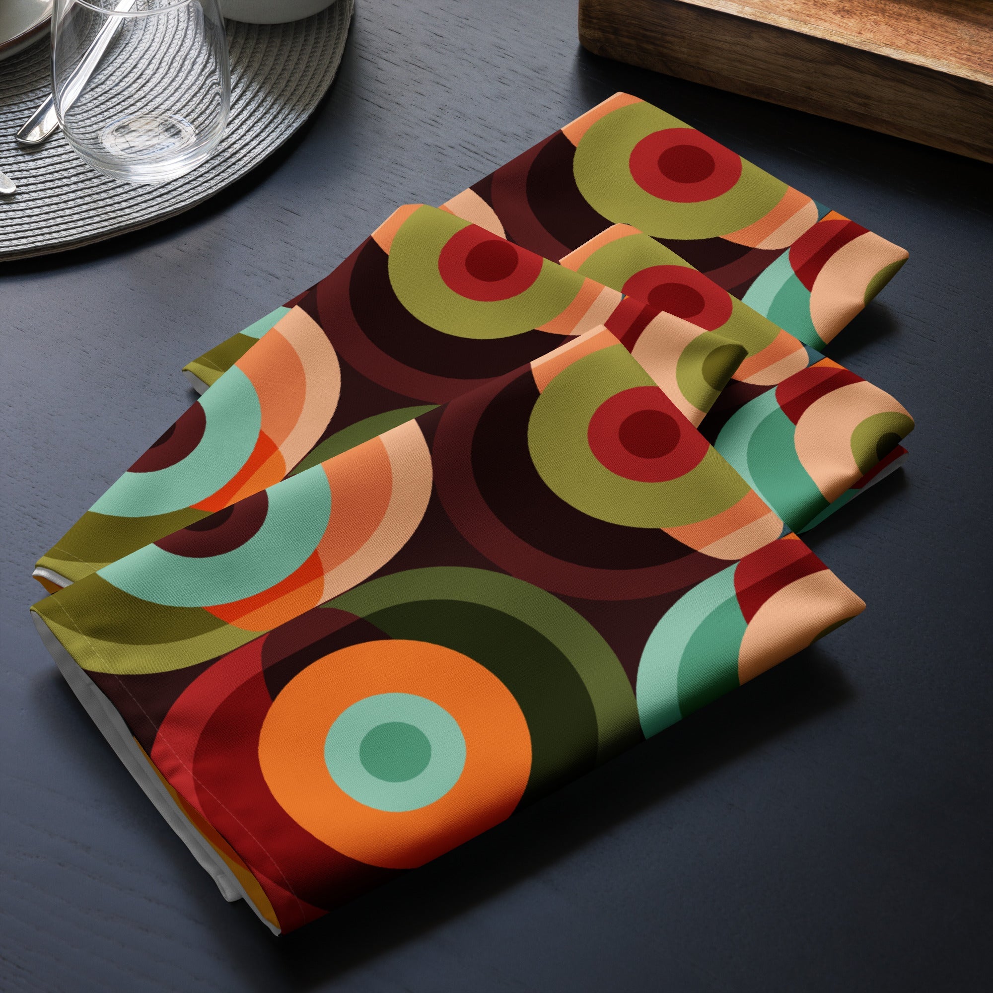 ¡Mejora tu experiencia gastronómica con estas servilletas de tela modernas y originales! En un juego de cuatro, estas servilletas presentan un diseño geométrico retro con esferas circulares de colores. Dile adiós a las servilletas de papel y añade un toque de fantasía a tu mesa.