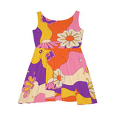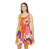 Vestido skater retro de mediados de siglo con estampado floral en tonos beige, naranja quemado, amarillo mostaza, morado y rosa.