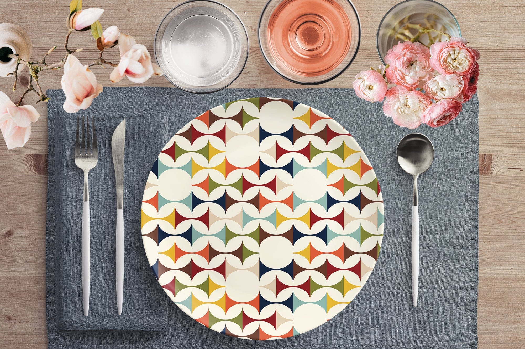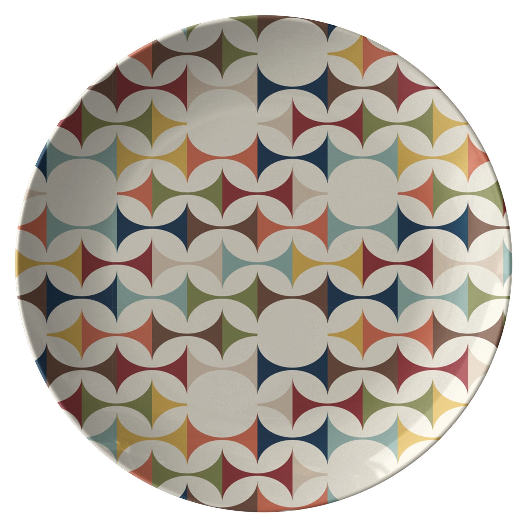 Plato llano geométrico retro moderno de mediados de siglo en crema, verde azulado, mostaza y óxido