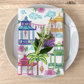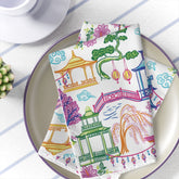 Ilumina tu comedor con nuestras vibrantes servilletas Chinoiserie. Este juego de cuatro servilletas rebosa de color, con extravagantes pagodas y una animada escena de jardín, que sin duda añadirá un toque festivo a cualquier comida.