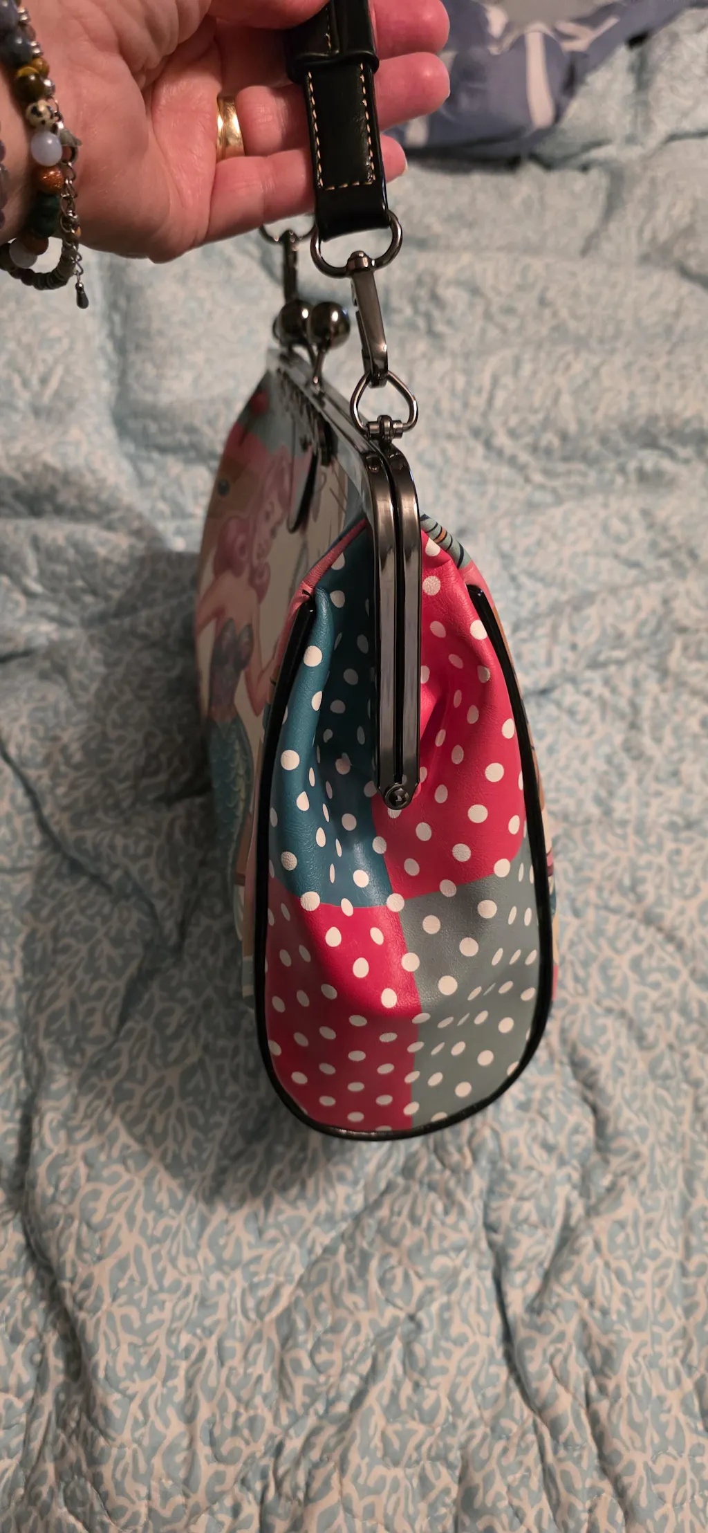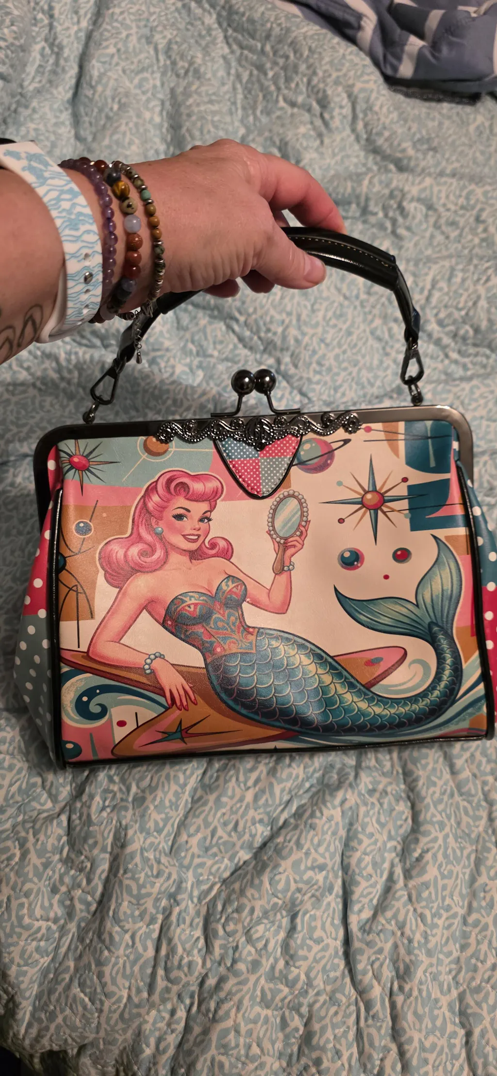 I have been away, so couldn't review sooner. I love my purse with my darling Mermaid and can't wait to show the women in my water aerobics group, since we call ourselves the Moody Mermaid. The purse itself is large enough, so well made, and colorful. Customer service is awesome. This really is a small business in the US. Although each is individually made, shipping was very fast. Thank you!