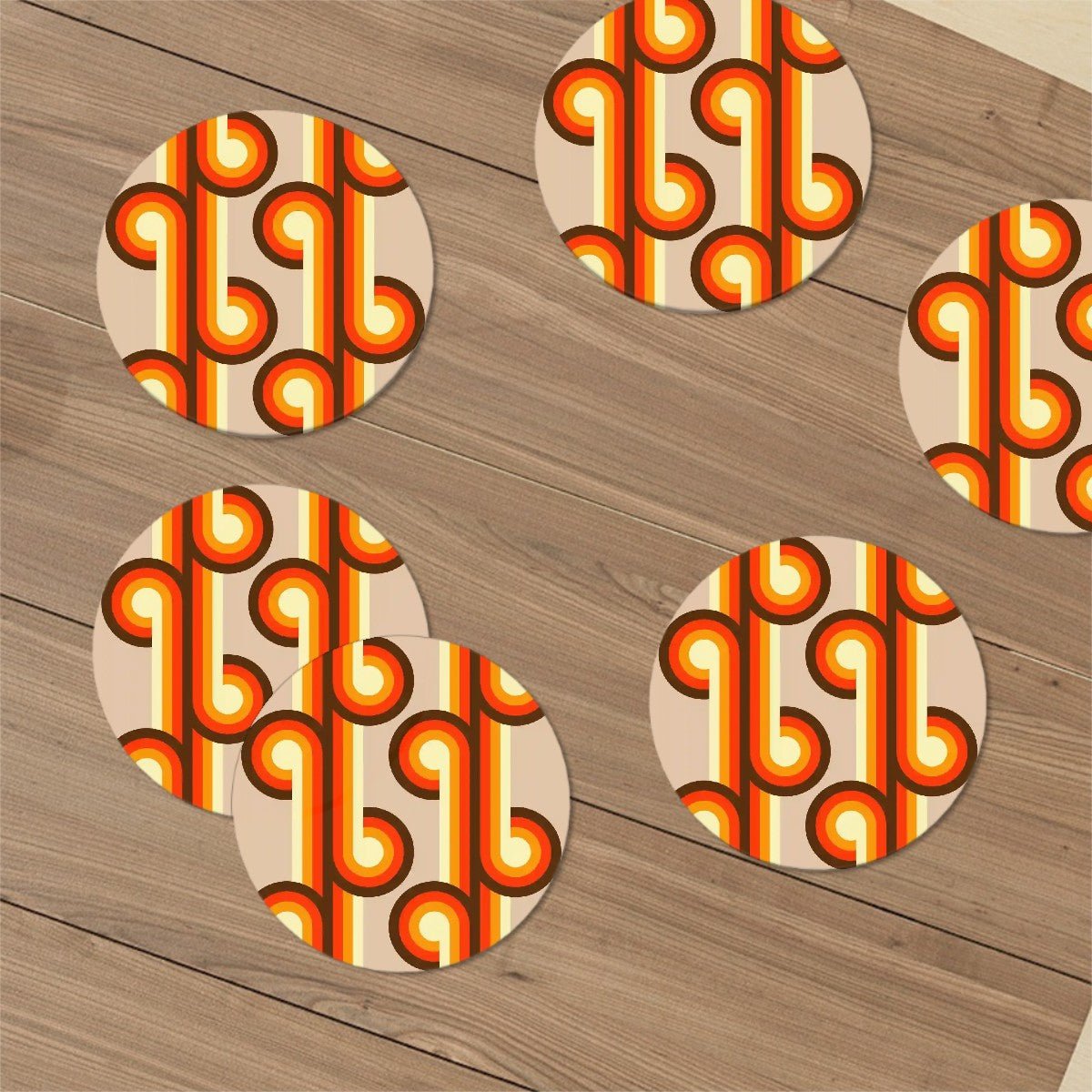 Bring the bold vibes of the 70s to your table with these groovy swirl ceramic coasters! Featuring a striking retro mod pattern in warm orange, yellow, and brown tones, these round coasters are a perfect addition to any mid-century modern or funky bar setup. Made from absorbent ceramic with a cork backing, they protect surfaces from spills while keeping drinks stylishly in place. The set includes six coasters with a sleek black metal holder for easy storage. Perfect for vintage enthusiasts, housewarming gifts, or anyone who loves a pop of retro flair!