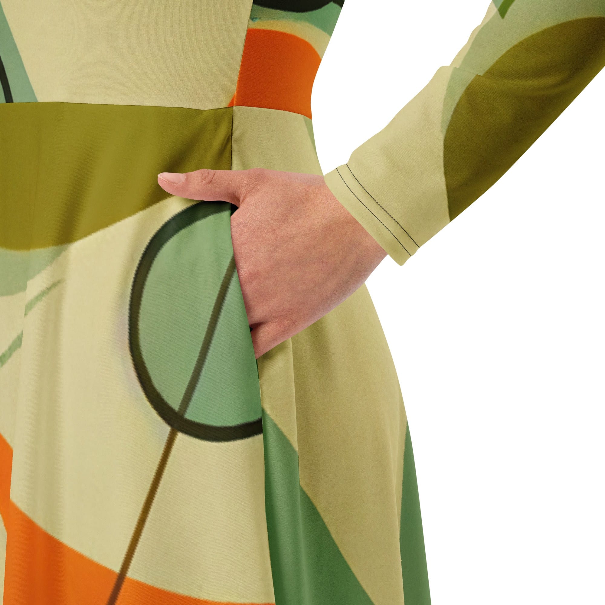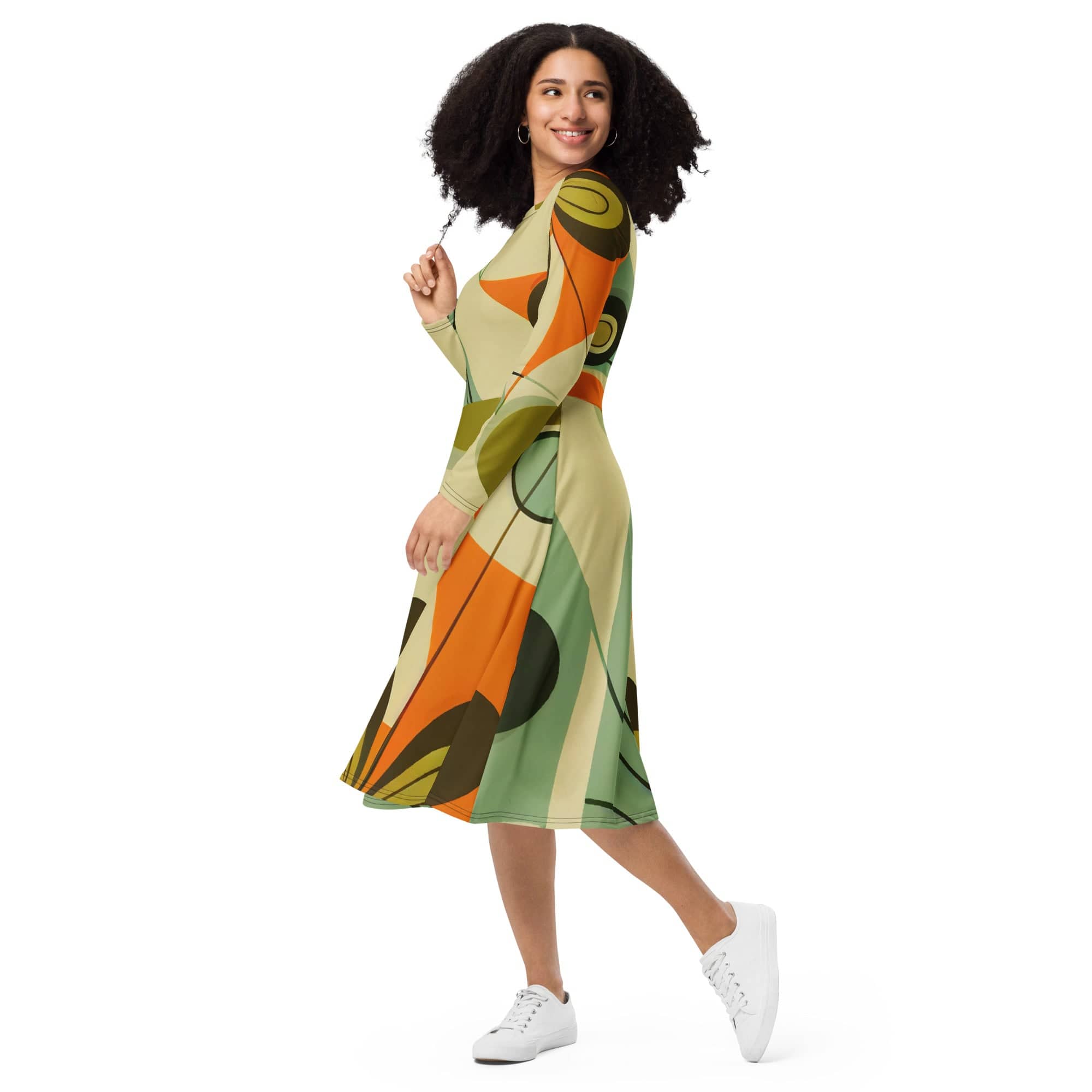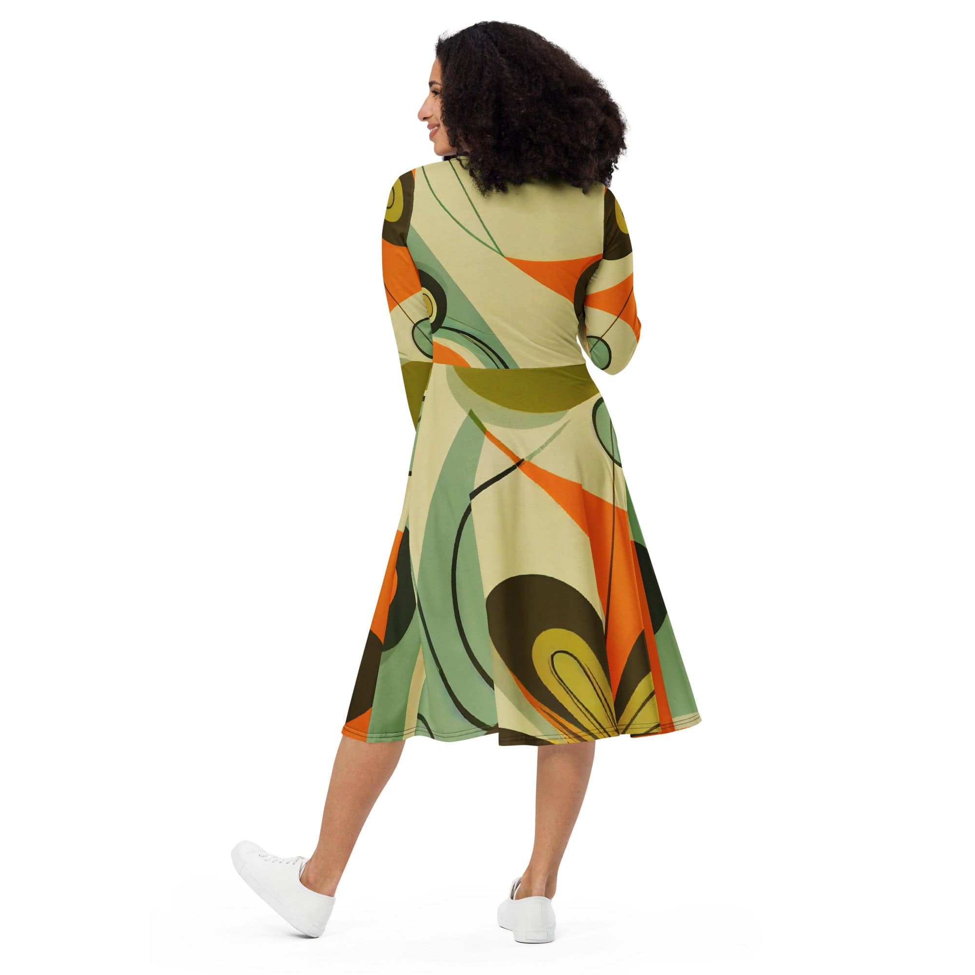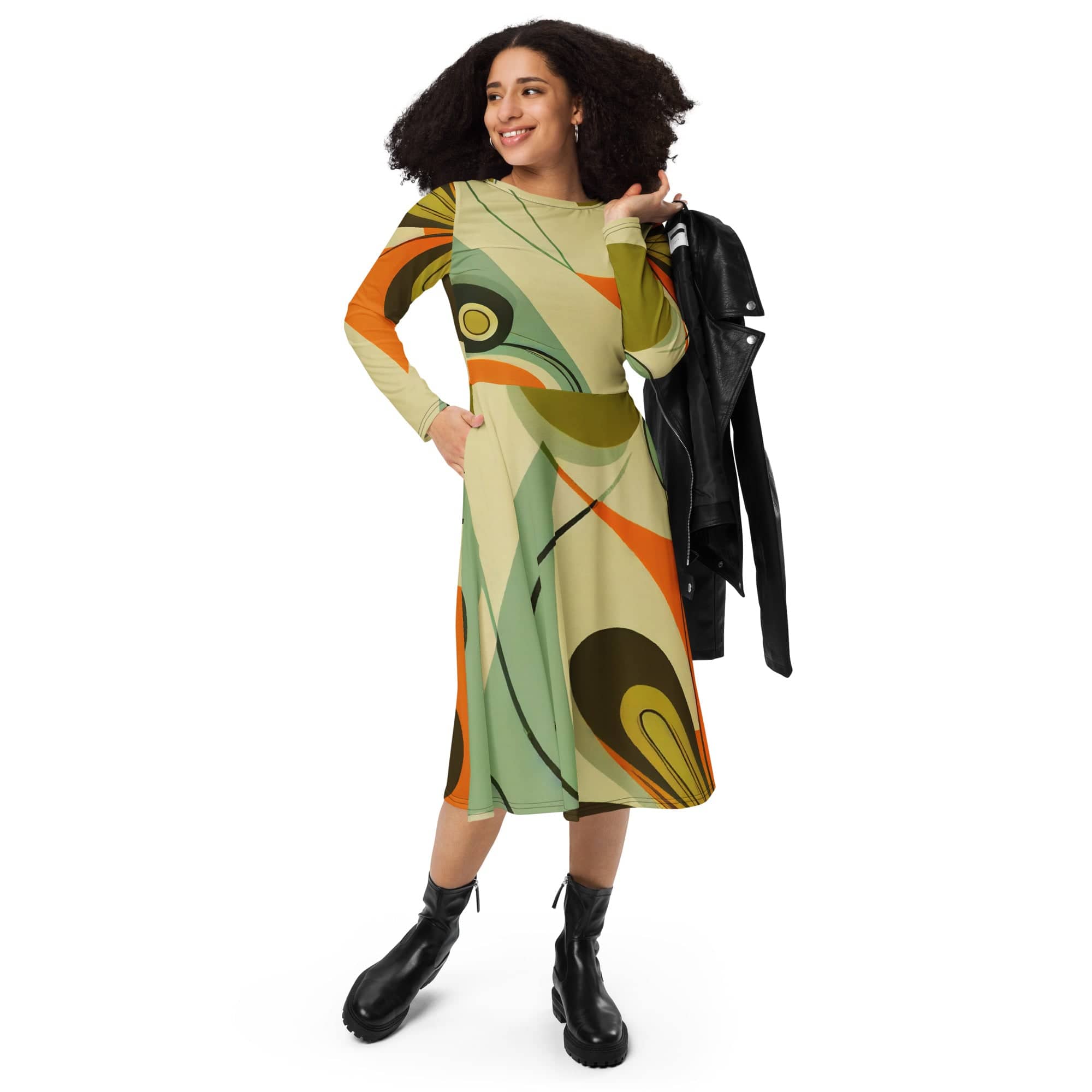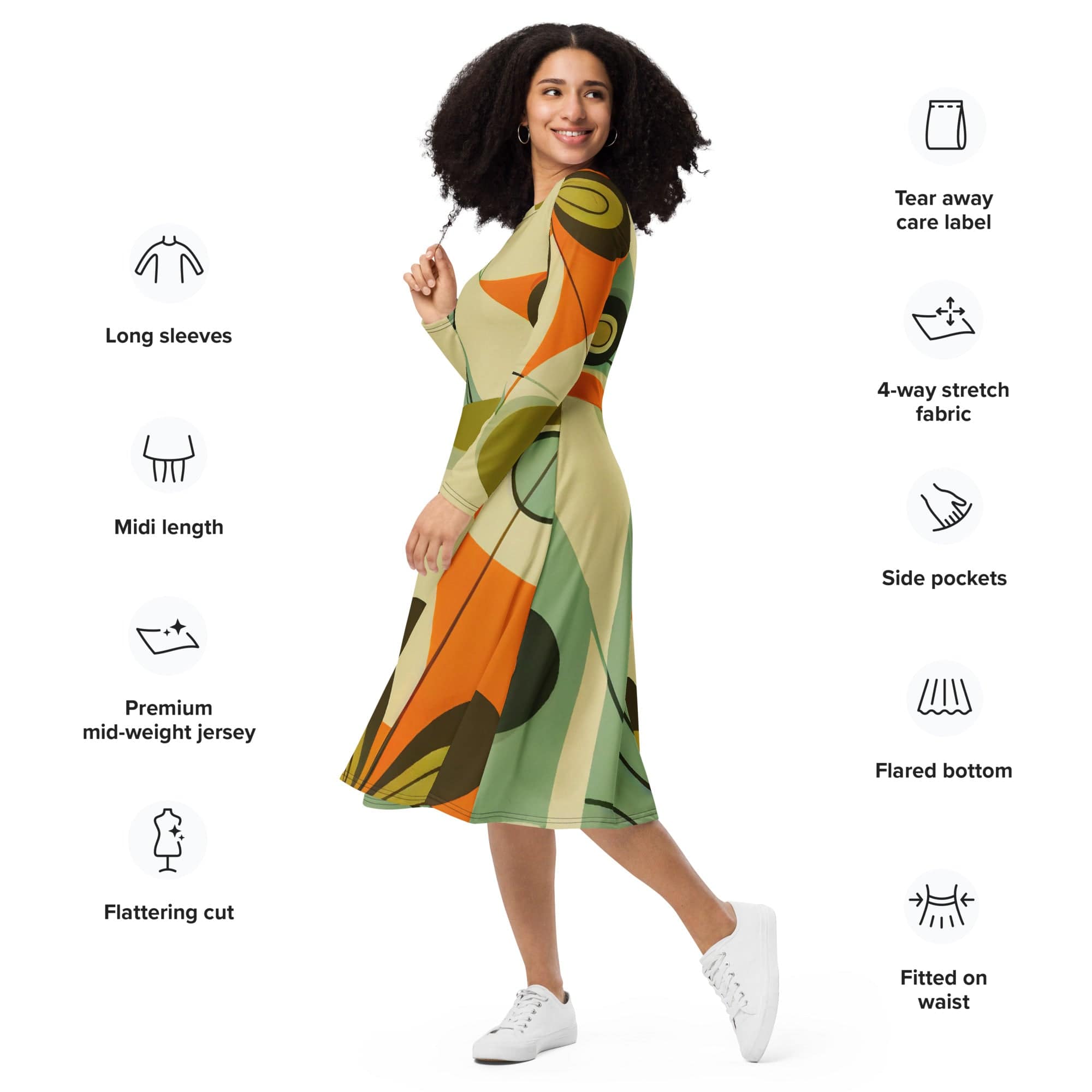 70s Retro Groovy Mid Century Modern Floral Printed Bohemian Boho Long Sleeve Midi Dress - 132282823