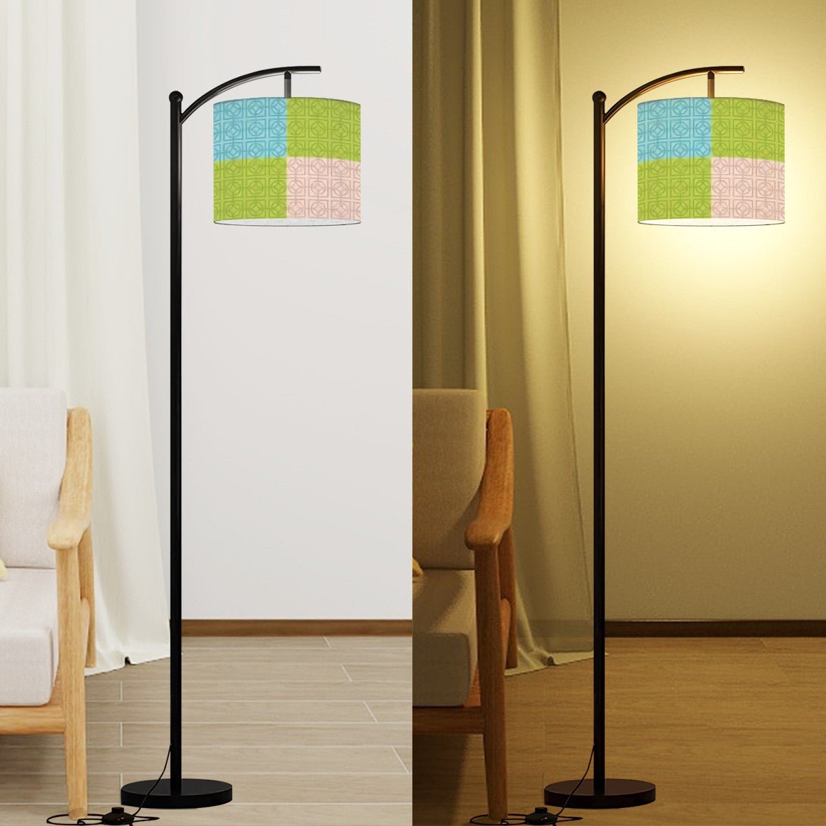 A mid-century modern arc floor lamp featuring a breeze block-inspired patchwork design in teal, green, and blush. The sleek arched base complements the geometric mod shade, adding a touch of atomic-age charm to any space. Perfect for lovers of retro minimalist decor!