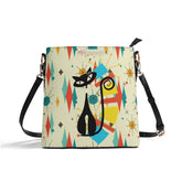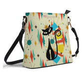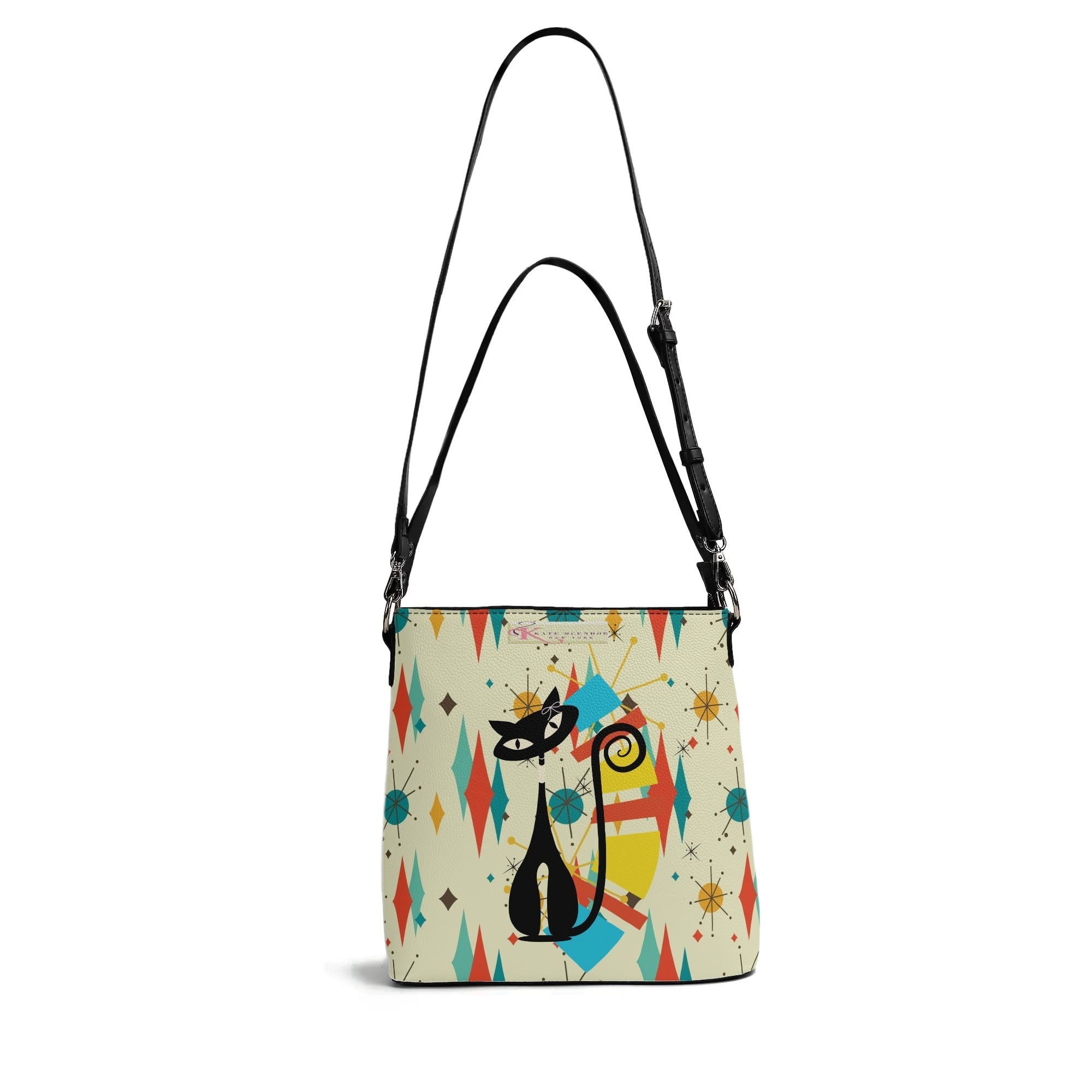Add some purr-fectly retro charm to your wardrobe with our Atomic Cat Bucket Bag! This mid-century modern Franciscan Diamond Starburst handbag is a stylish and unique addition to any outfit. With its quirky design and practical shoulder strap, it's the perfect accessory for any cat lover.