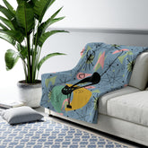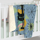 Stay crazy cozy with this far out atomic cat blanket! Bold teal, pink and lime starbursts and geometric shapes surround a cool cosmic atomic kitty. Soft sherpa fleece adds retro flair.