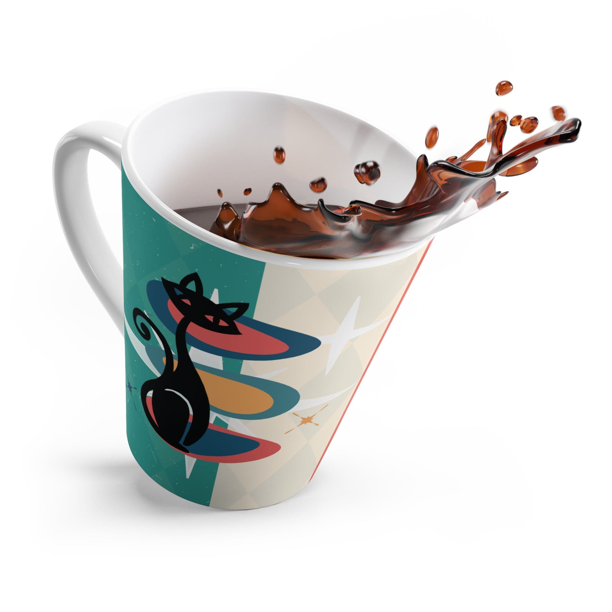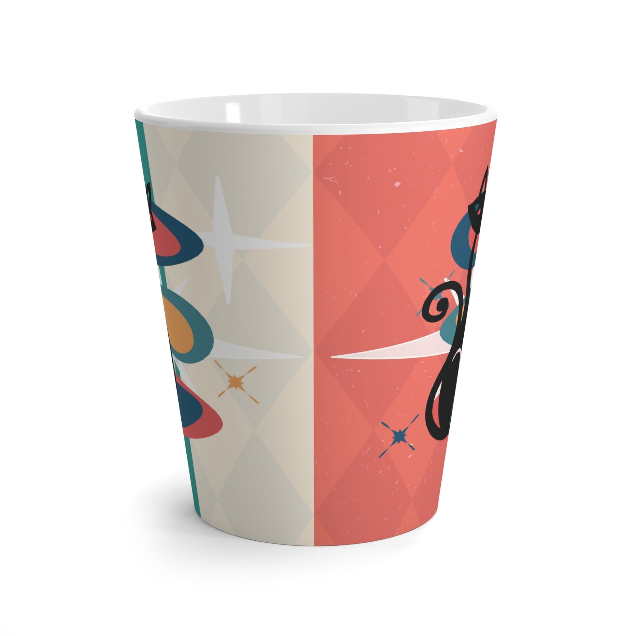 Atomic Cat Latte Mug, Retro Space Age Coffee Cup, Mid Century Modern Feline Design