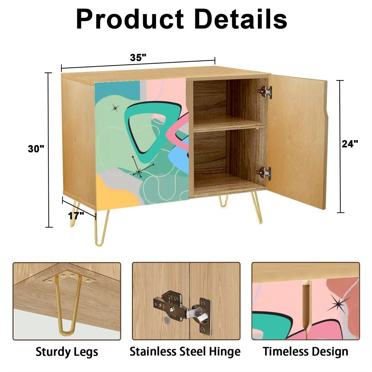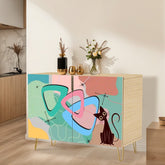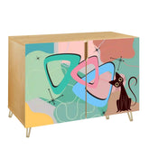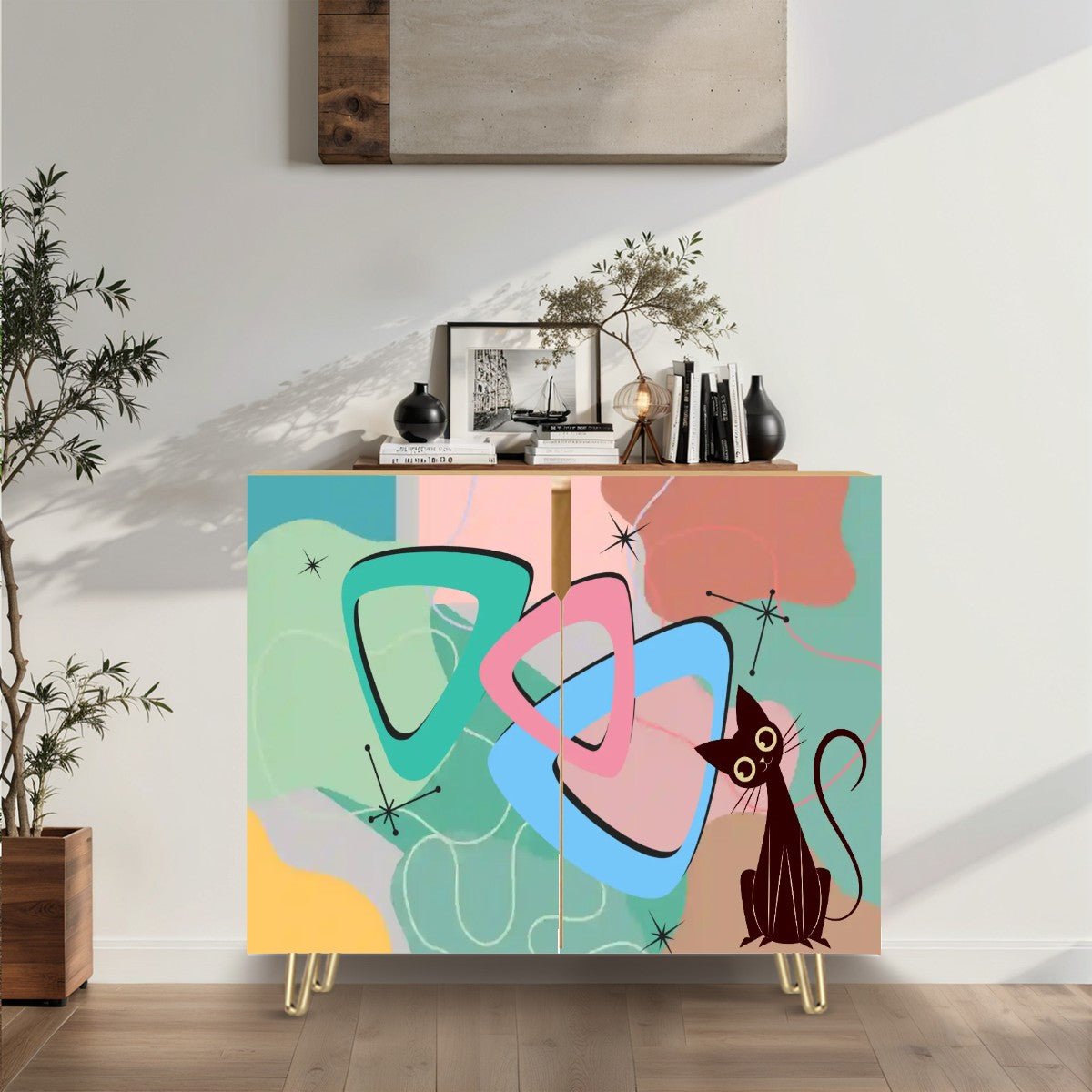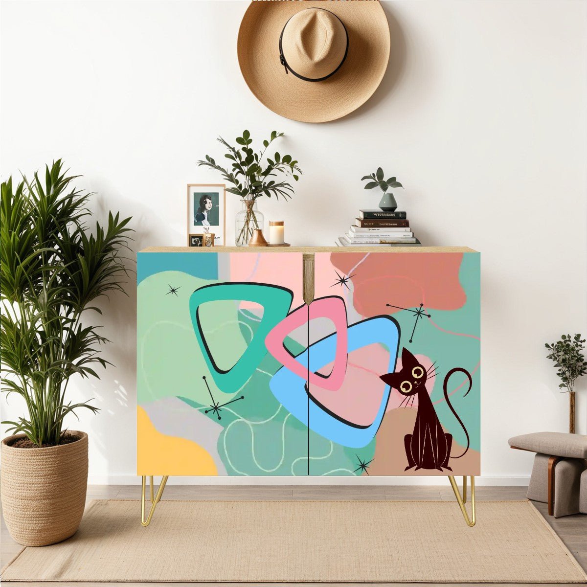 This mid-century modern credenza is bursting with Atomic Age charm! Featuring the Atomic Cat lounging in a retro Googie dreamscape, this statement piece is pure 1950s nostalgia. The starburst accents, mod color palette, and sleek hairpin legs bring vintage style to any space. Functional and fabulous, this cabinet is perfect for stylish storage.