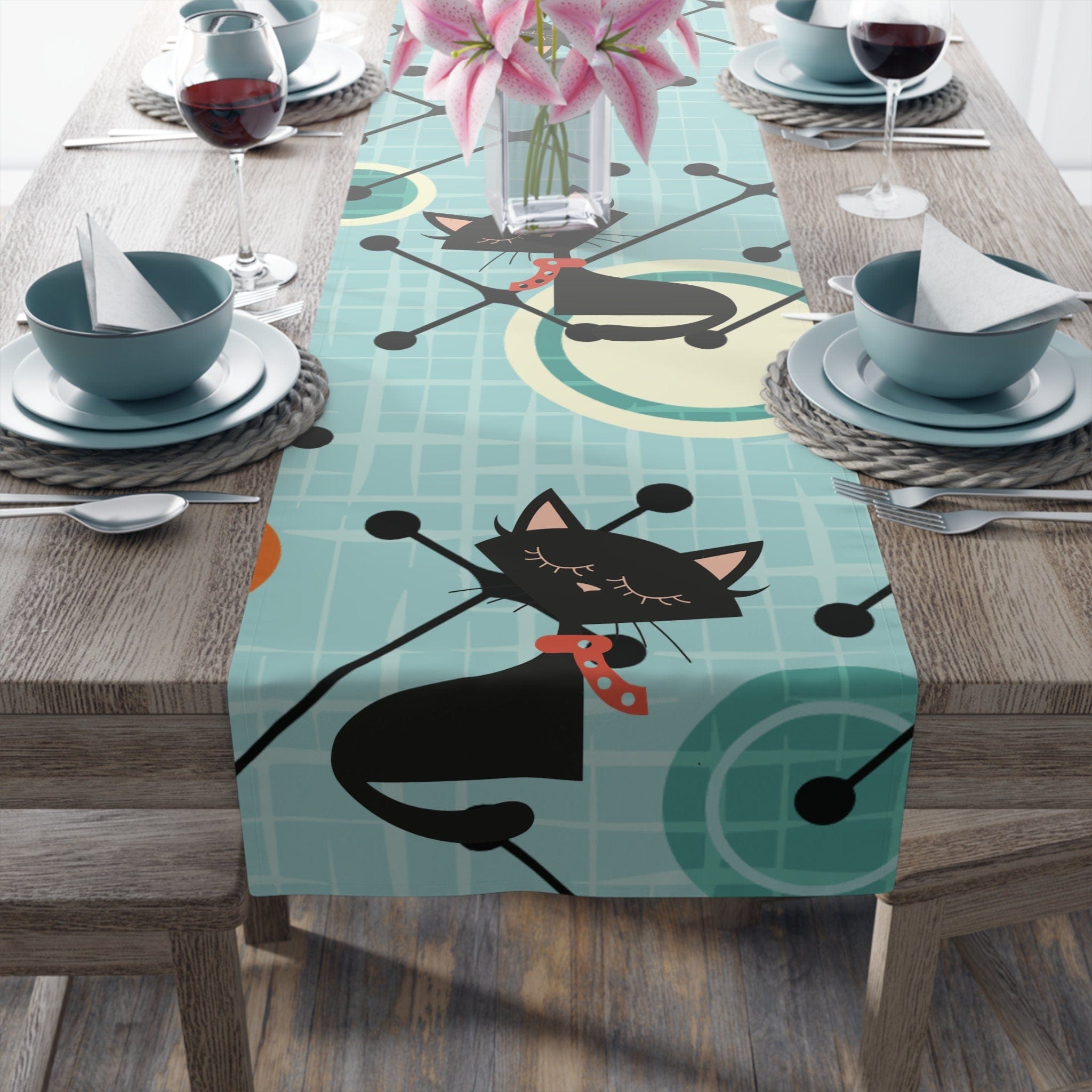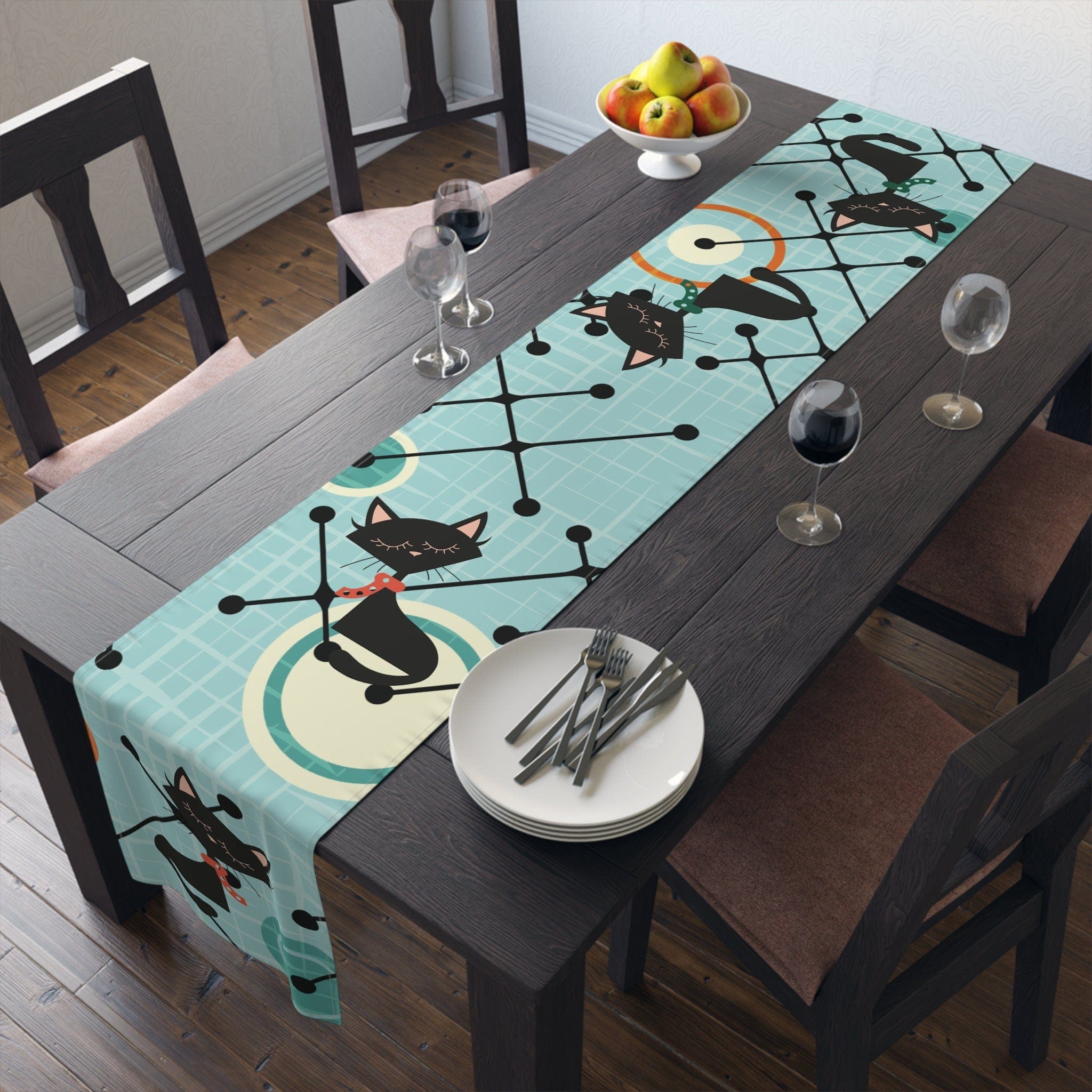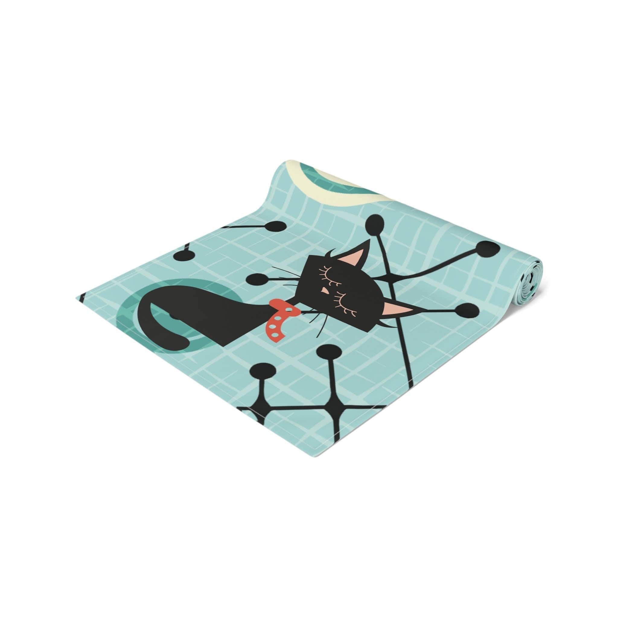 Atomic Cat Mid Century Modern Geometric Table Runner, 1950s Retro Kitschy Table Linens, Atomic Age Decor