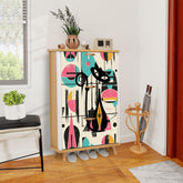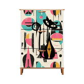 Add some atomic flare to your entryway with this Mid Century Modern shoe cabinet. The 50s geometric design provides both style and storage, making it a purr-fect addition to any home. Keep your shoes organized with a touch of retro charm.