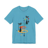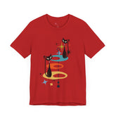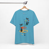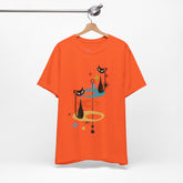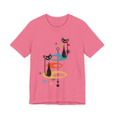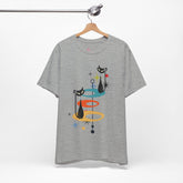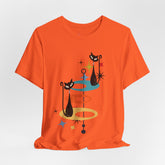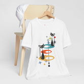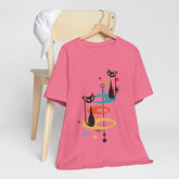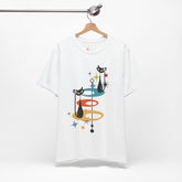 Step into the Atomic Age with this mid-century modern t-shirt featuring the iconic Atomic Cat perched on colorful orbs with a starburst backdrop. A must-have for retro enthusiasts, this soft and stylish tee brings 50s kitsch flair to any outfit. Perfect for lovers of vintage, space-age aesthetics, and MCM design.