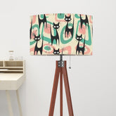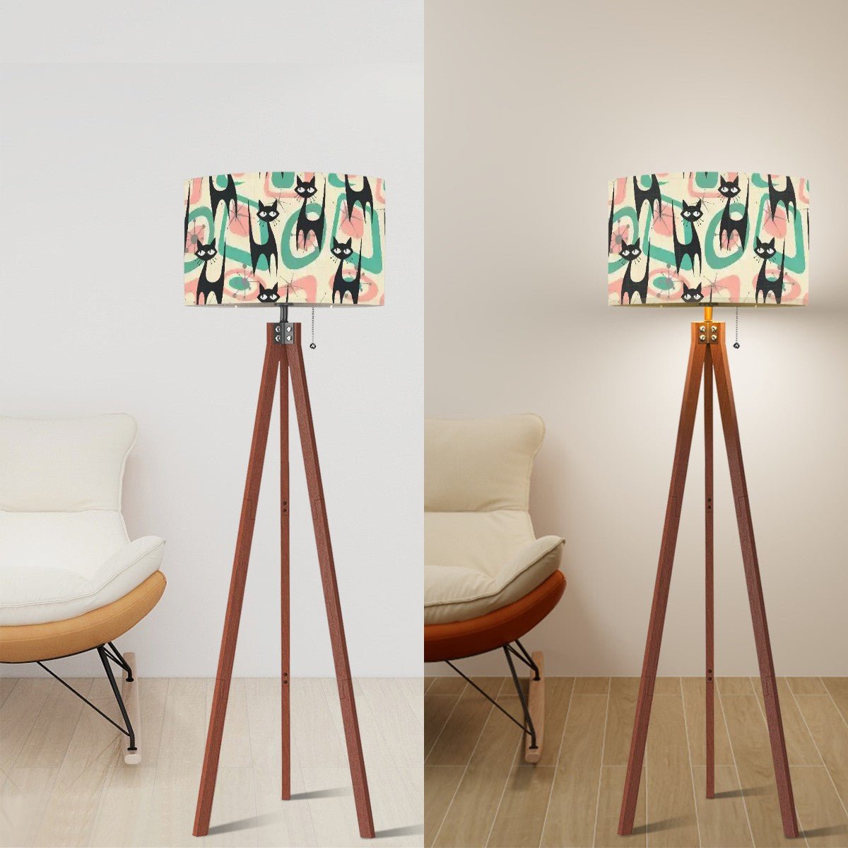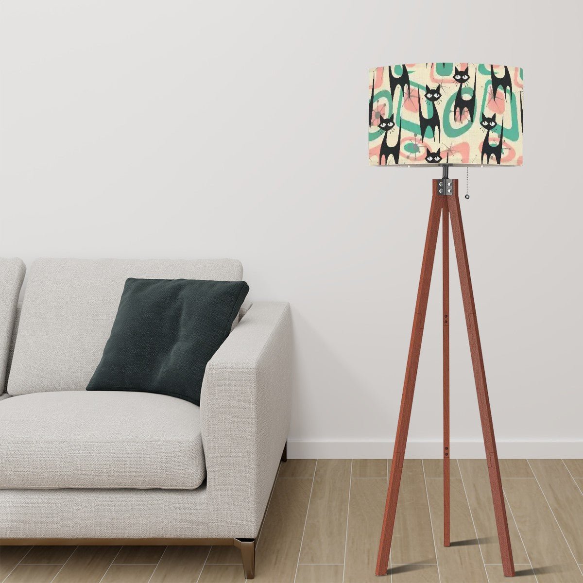 Light up your space with this Atomic Cat tripod floor lamp—a purrrfect nod to mid-century modern style! Featuring sleek wooden legs and a bold drum shade with whimsical Atomic Cat prints, this lamp effortlessly mixes retro vibes with modern functionality. The playful cat design paired with soft pastel accents is ideal for creating a groovy ambiance in any room. Perfect for your living room, bedroom, or reading nook, this statement piece is the cat's meow of MCM decor!