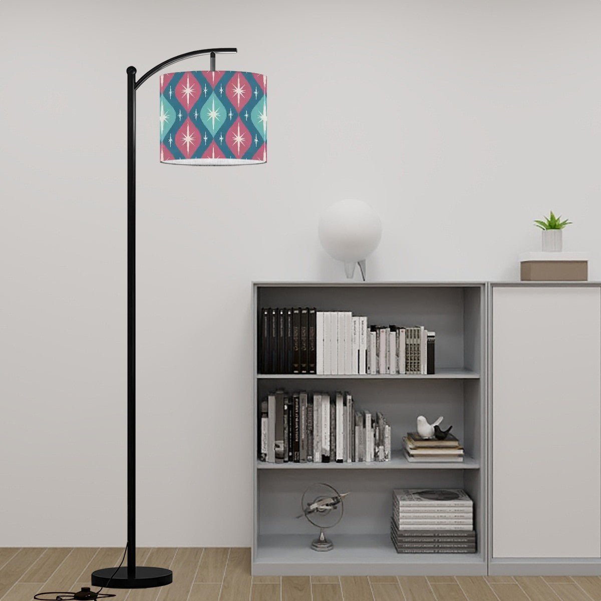 Elevate your space with this atomic diamond starburst arc floor lamp, a showstopping piece straight out of the 50s! This mid-century modern beauty boasts a bold geometric design with retro starbursts and atomic diamonds, creating a striking focal point. Its sleek arc shape pairs with a linen lampshade that diffuses warm, ambient light—perfect for a swanky lounge or stylish living room.