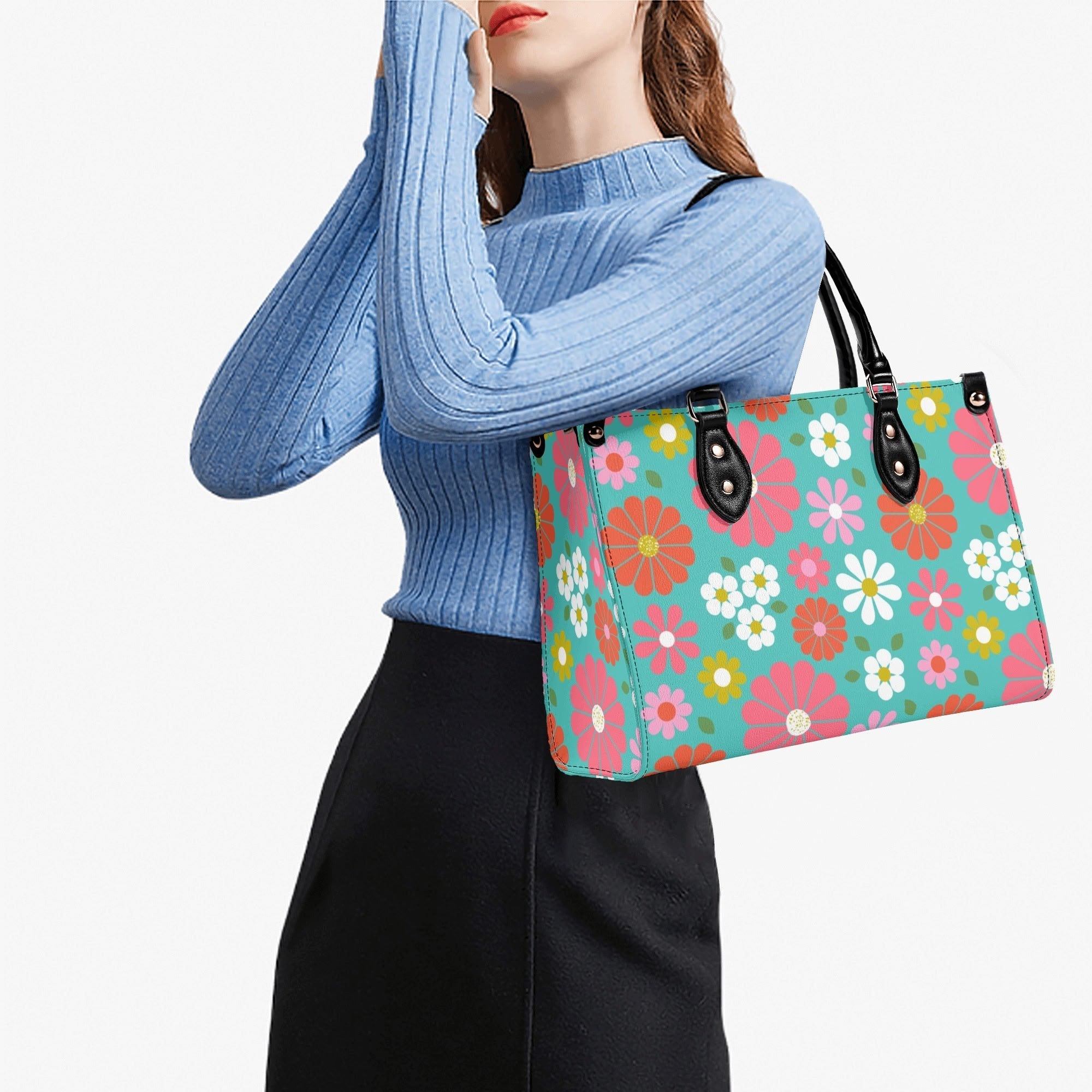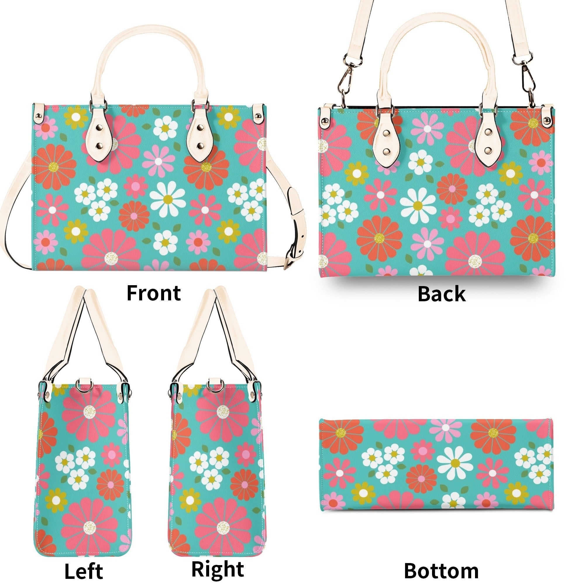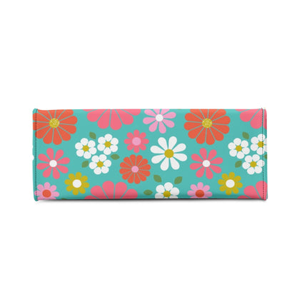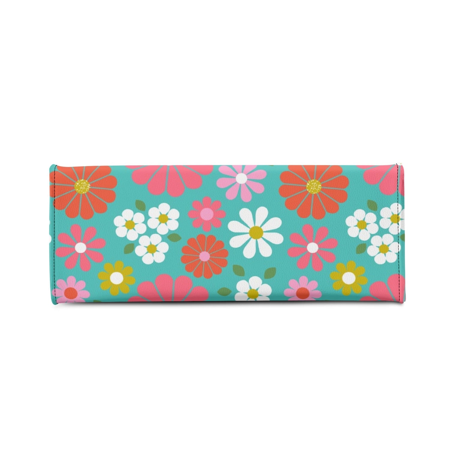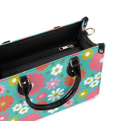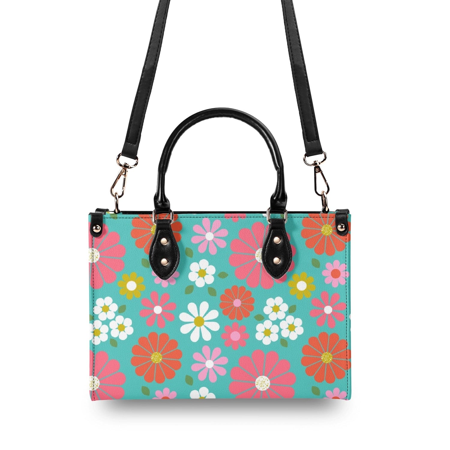 Get groovy with our Flower Power MCM 1970s Retro Handbag! This colorful bag features a vibrant floral design in pink and teal, perfect for any free-spirited hippie. Embrace your inner flower child with this mid century modern accessory.