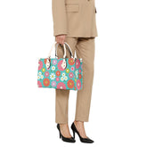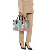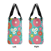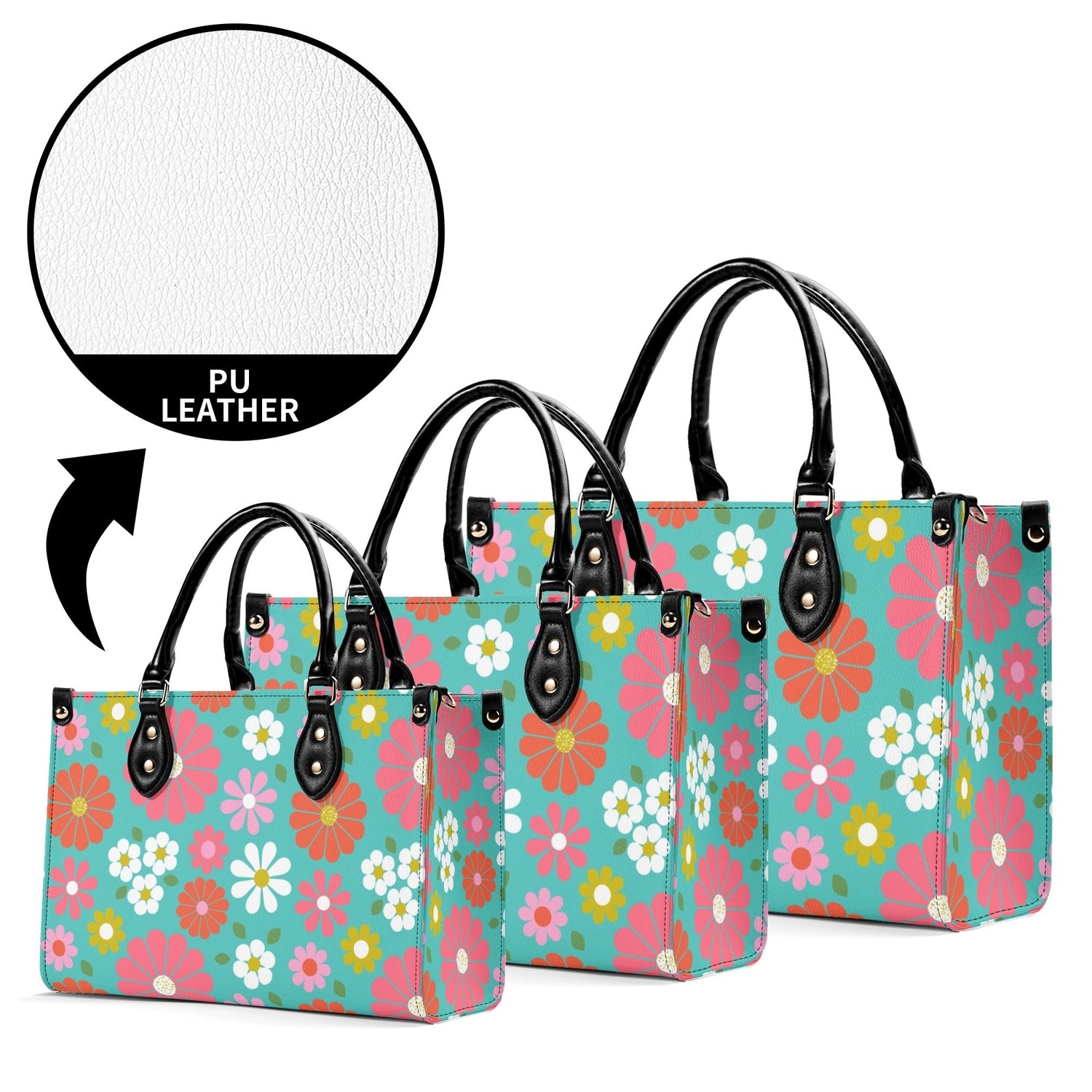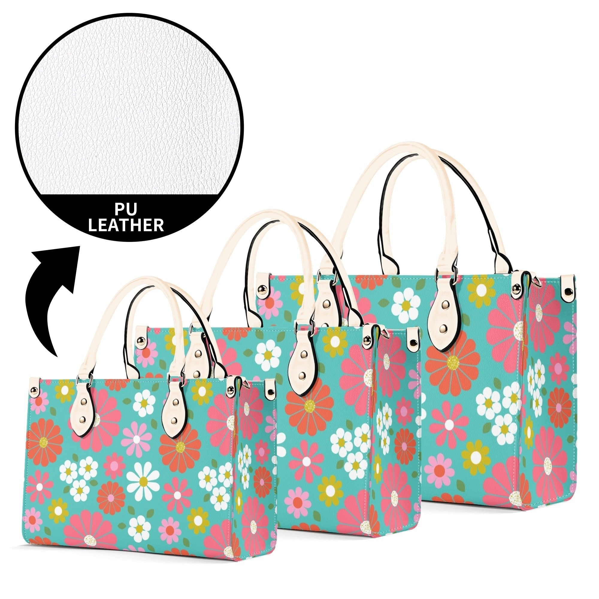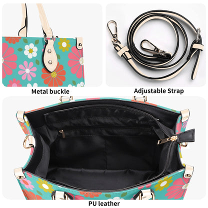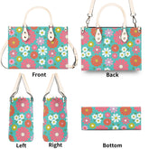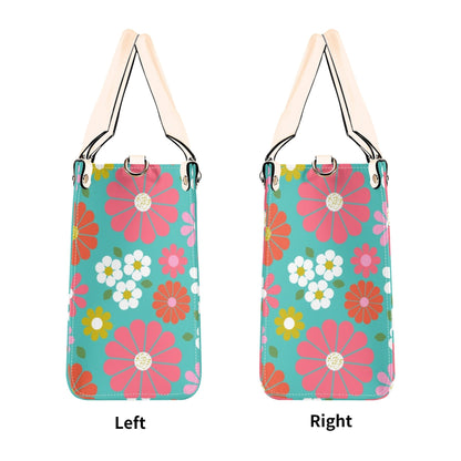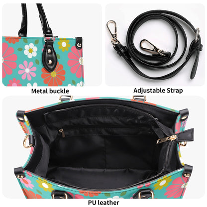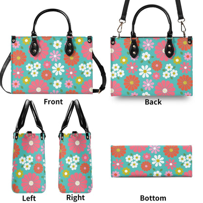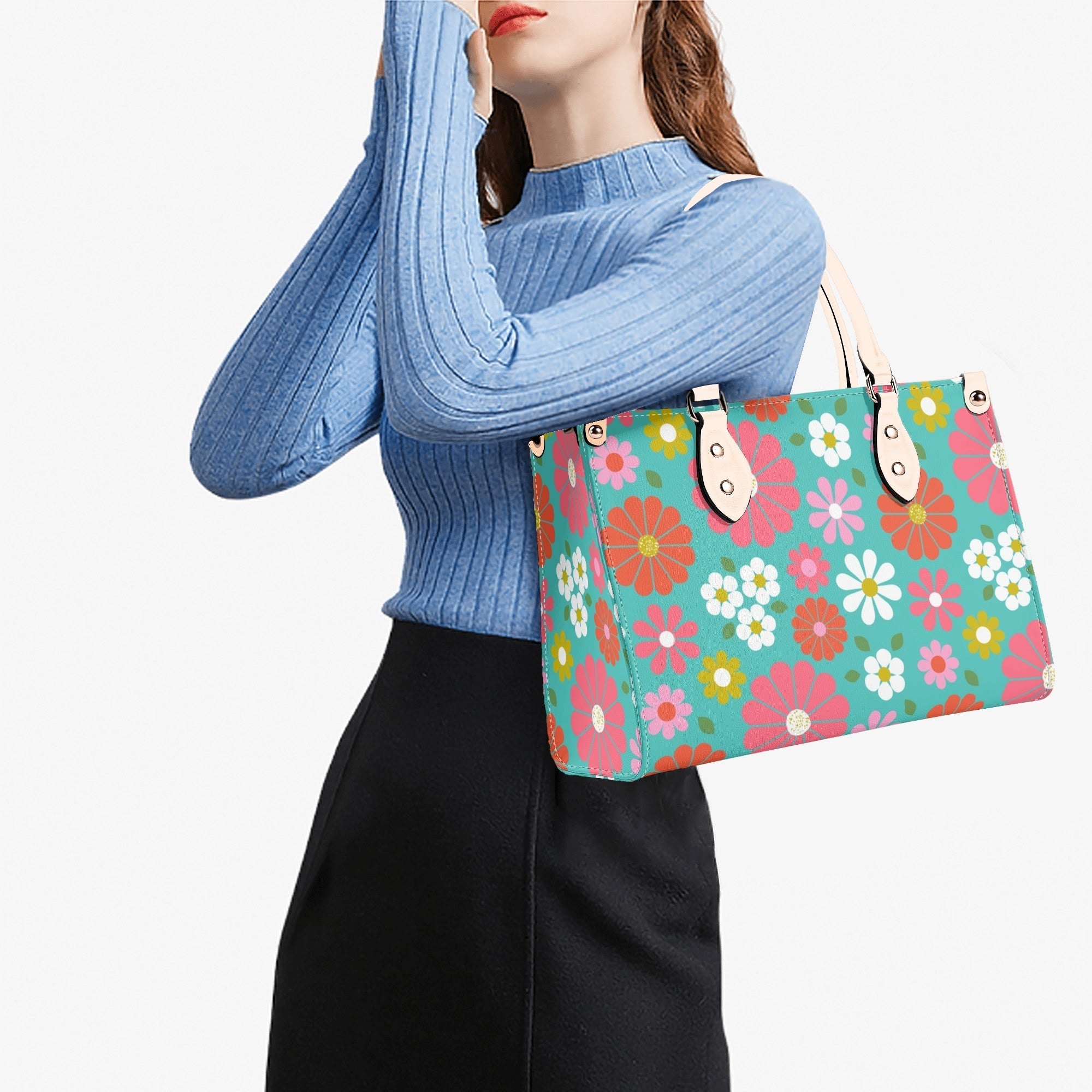 Get groovy with our Flower Power MCM 1970s Retro Handbag! This colorful bag features a vibrant floral design in pink and teal, perfect for any free-spirited hippie. Embrace your inner flower child with this mid century modern accessory.