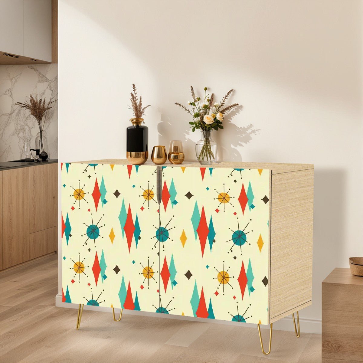 Bring on the mid-century magic with this Franciscan Diamond Starburst cabinet! Featuring the iconic atomic-era starburst in vibrant retro hues, this credenza is a must-have for any MCM enthusiast. Sleek gold hairpin legs and a bold geometric design make it a standout piece, perfect for adding a pop of vintage charm to your space.