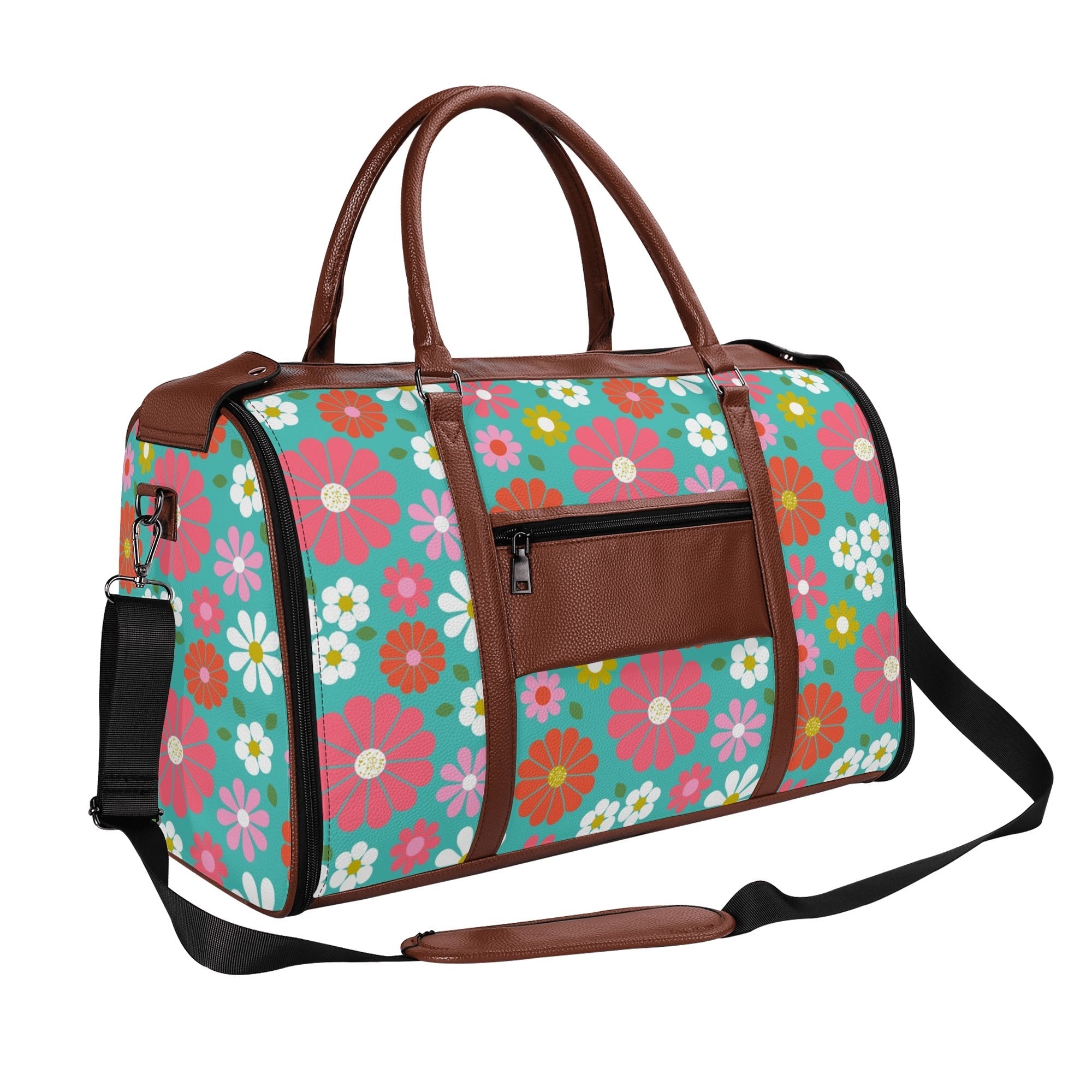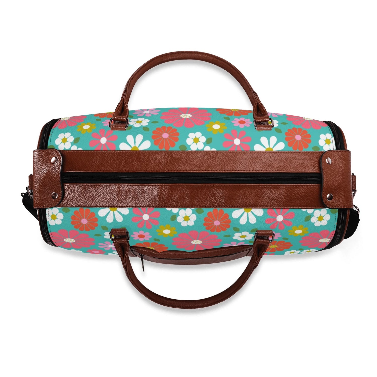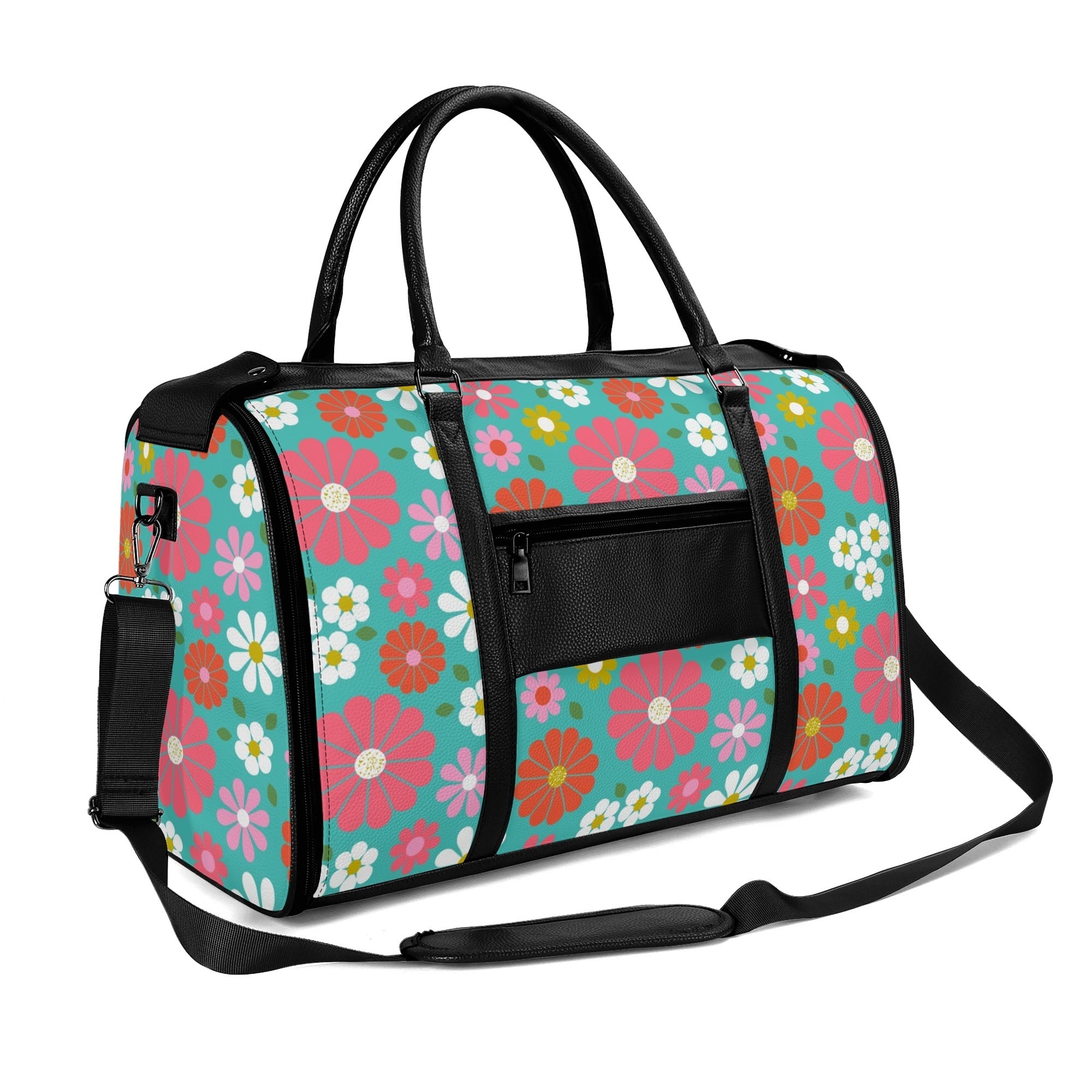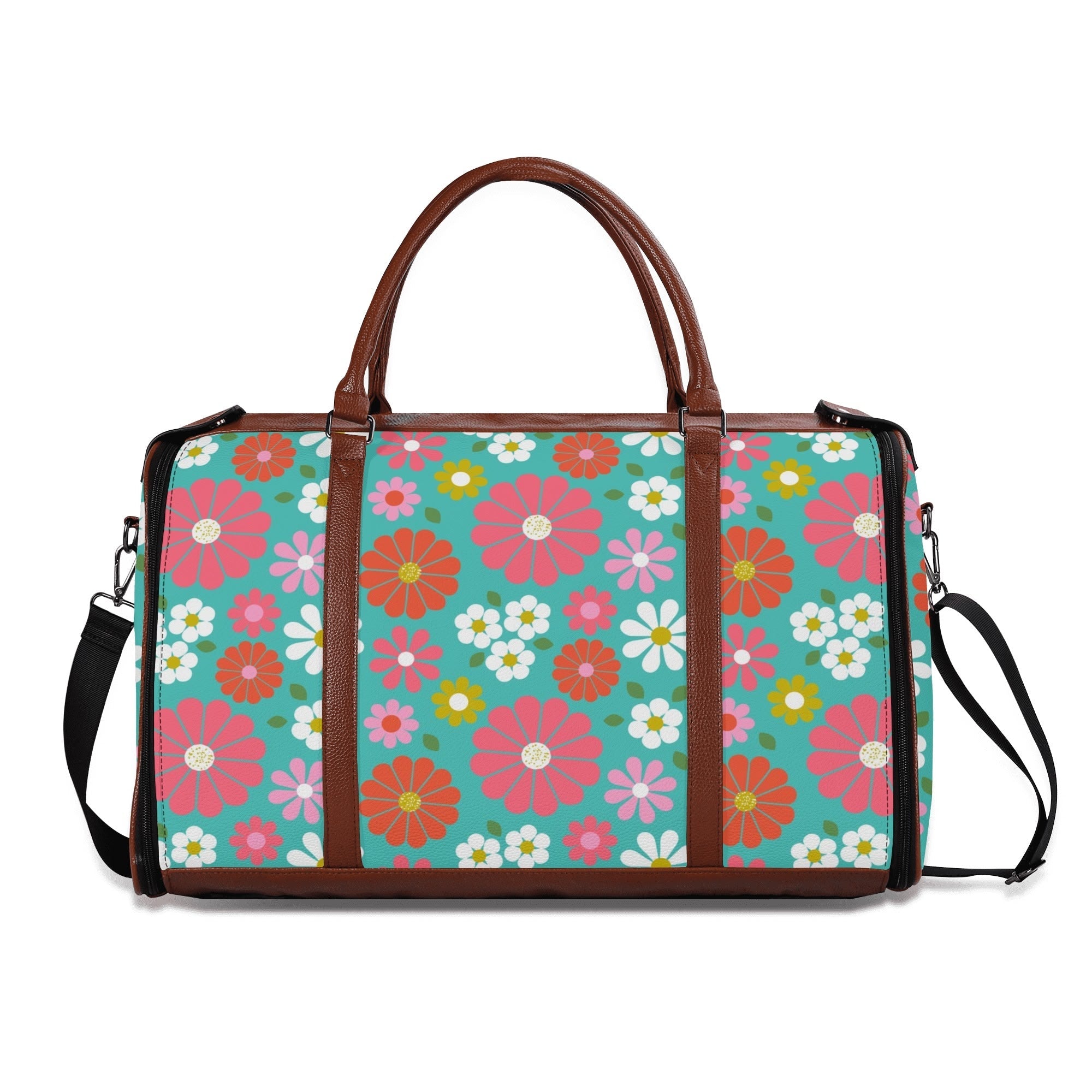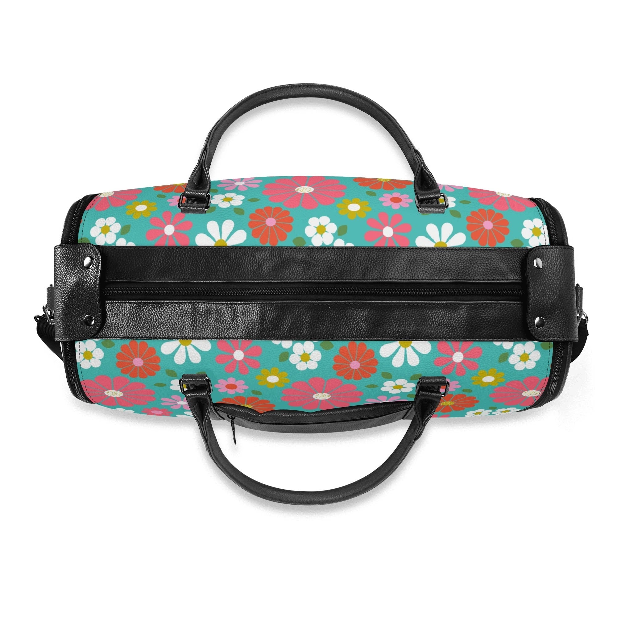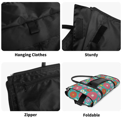 Get your groove on with this far-out 70s flower power duffel bag! Bursting with bold daisies in bright pink, orange, yellow, and teal, this retro-chic weekender is a must-have for vintage-loving travelers. Spacious, durable, and foldable, it's the perfect carry-on for road trips, festivals, or weekend getaways. A totally fab statement piece for anyone who digs that nostalgic mod vibe!