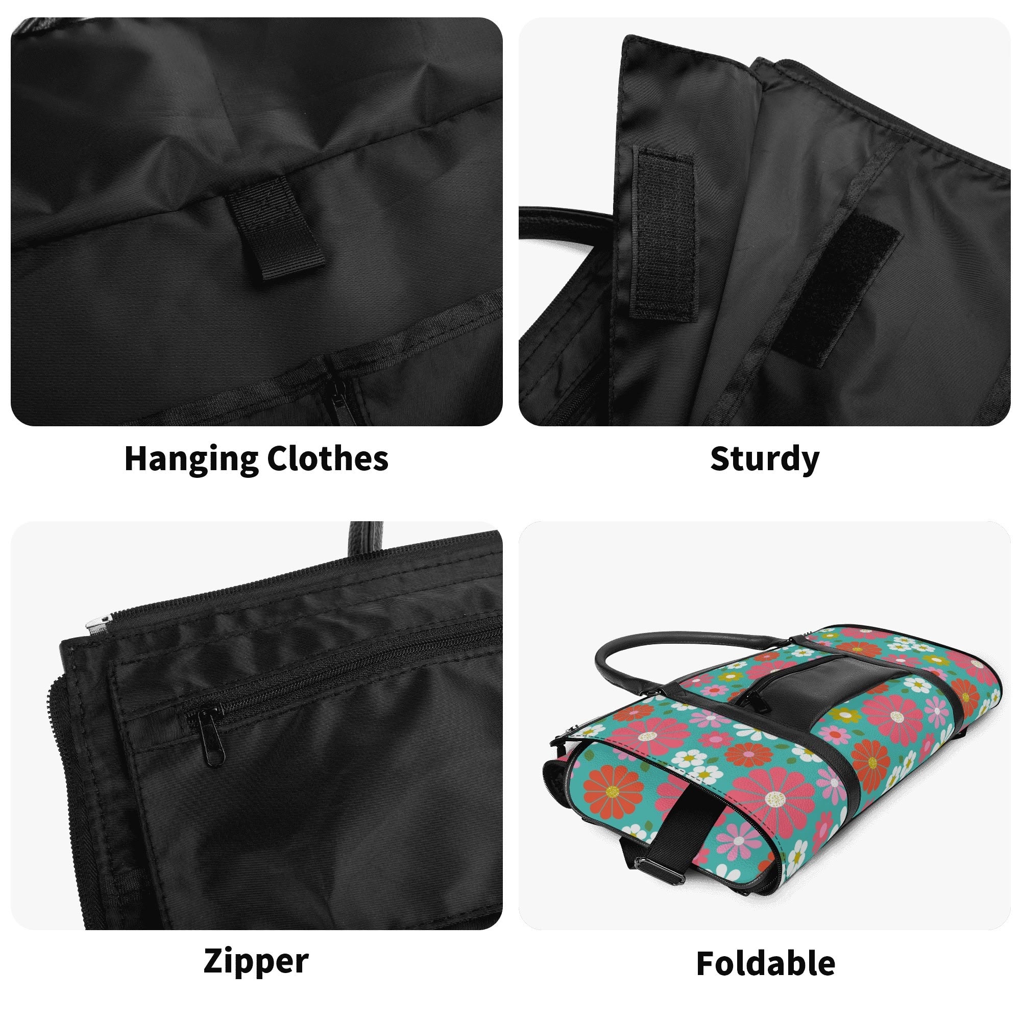 - Storage: Spacious main compartment with interior zipper pockets, hanger lanyard for suits, and side pockets for shoes
