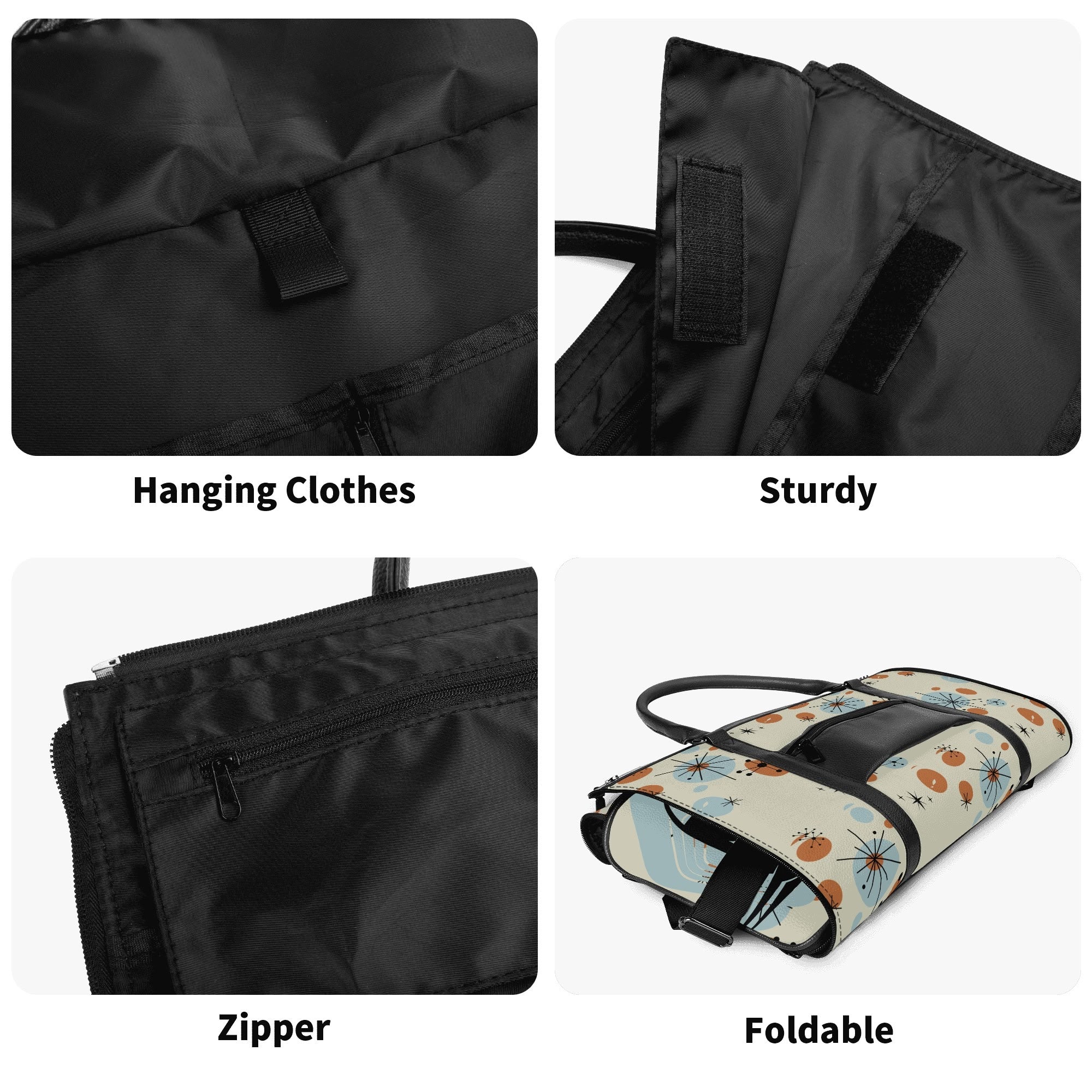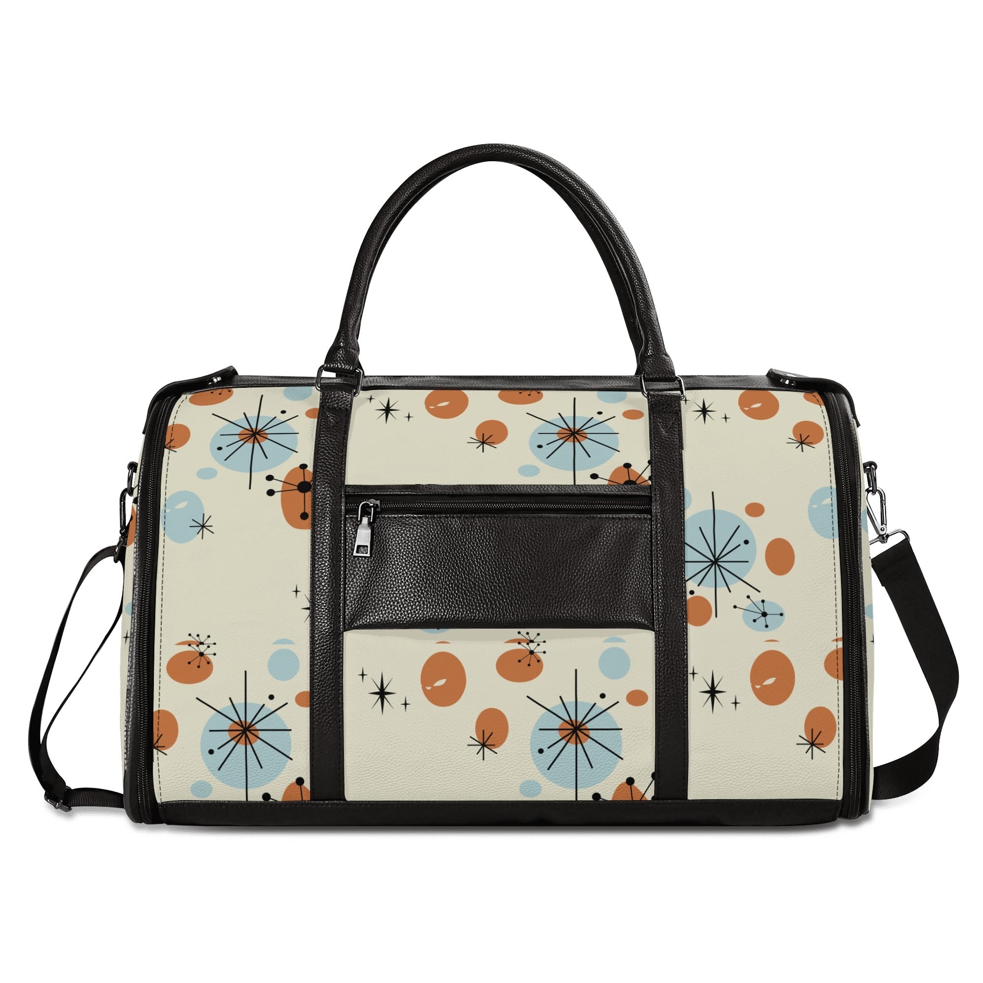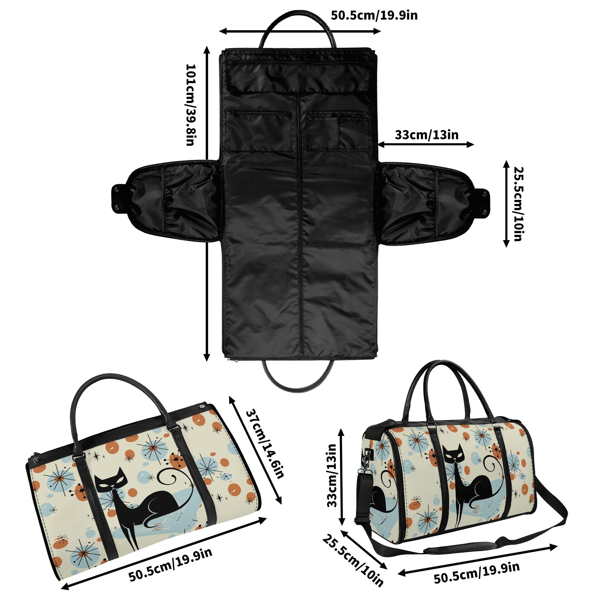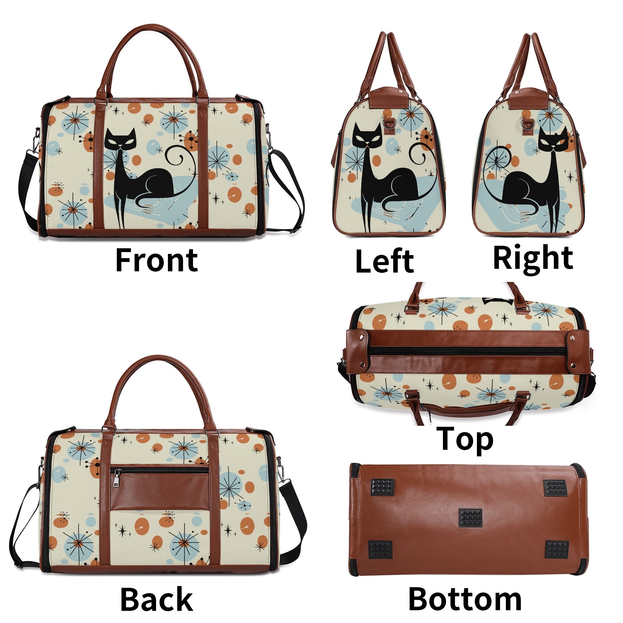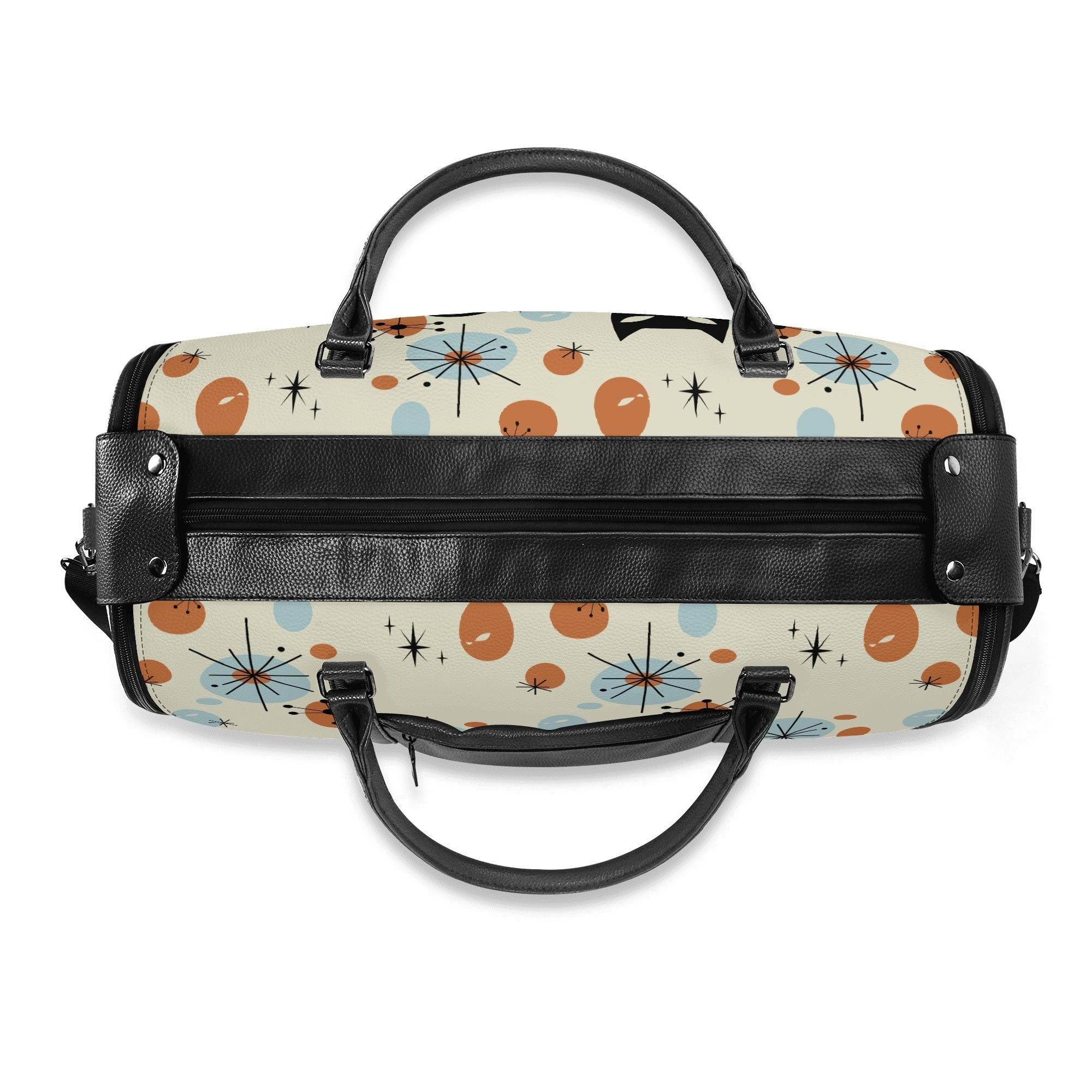 Retro travel meets kitschy flair with this Atomic Cat duffel bag. Featuring a Sexton cat-inspired mid-century modern design, this stylish weekender is perfect for vintage lovers.