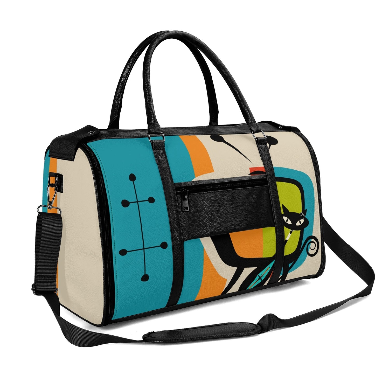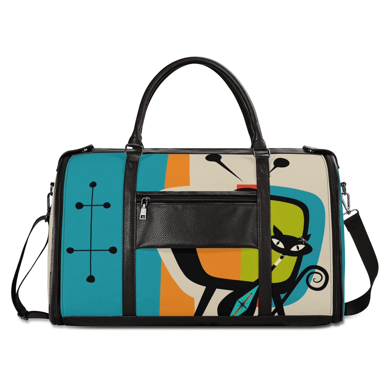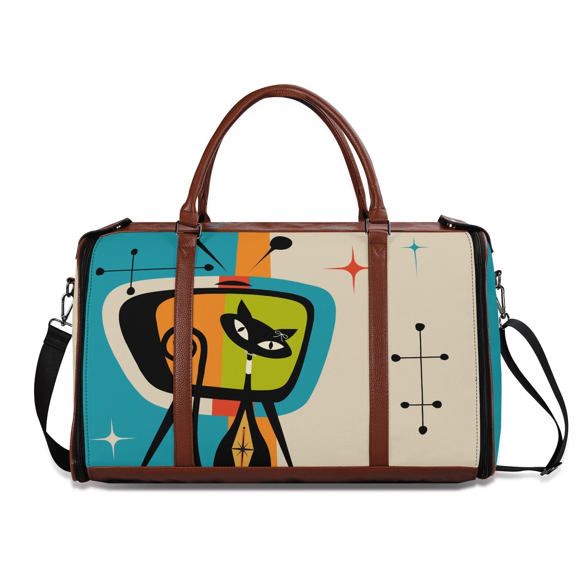 Step into a retro dream with this Atomic Cat duffel bag, featuring a vintage TV frame and atomic starbursts in bold mid-century colors. This Space Age-inspired weekender is perfect for stylish getaways, road trips, or everyday mod adventures. Functional, fashionable, and bursting with 50s charm.