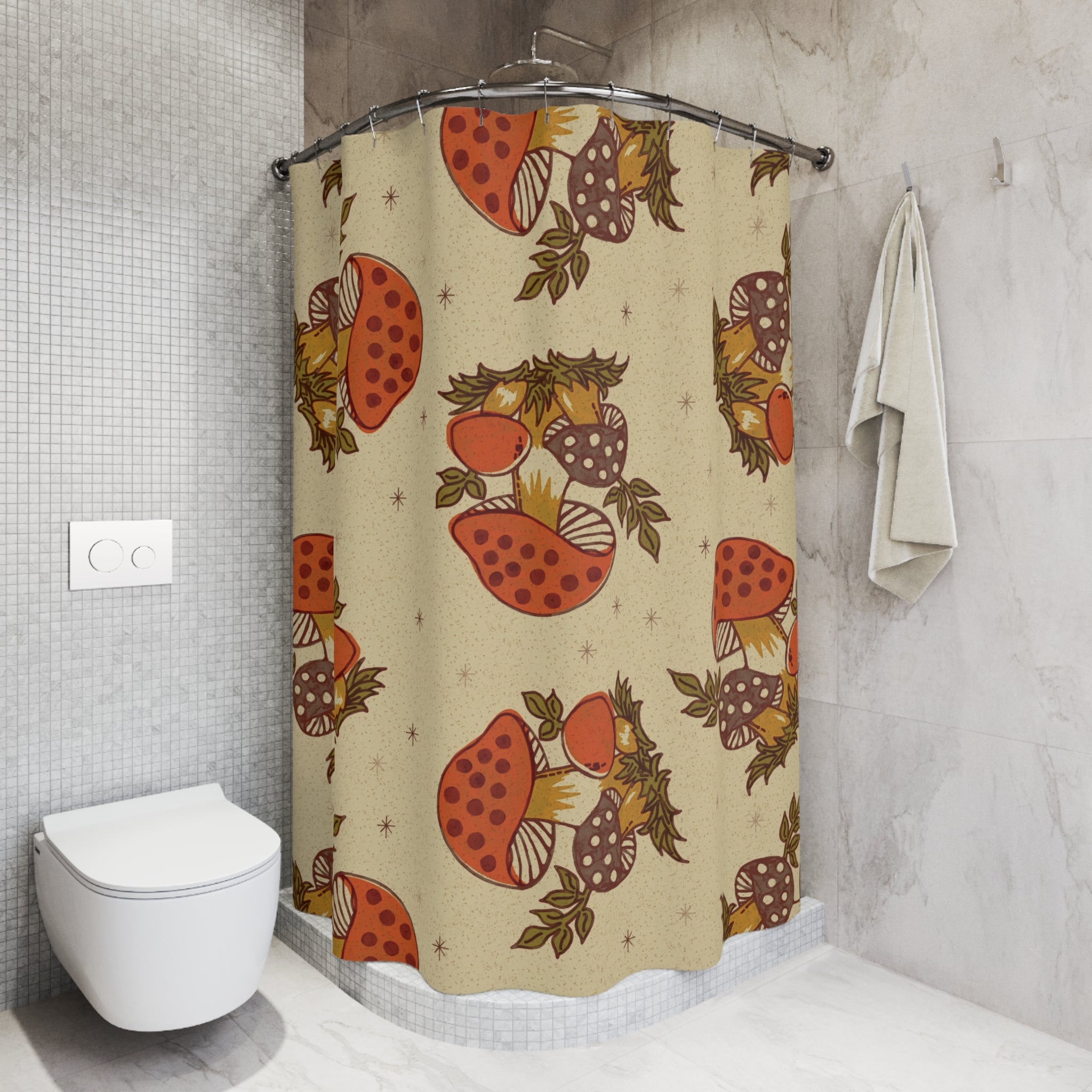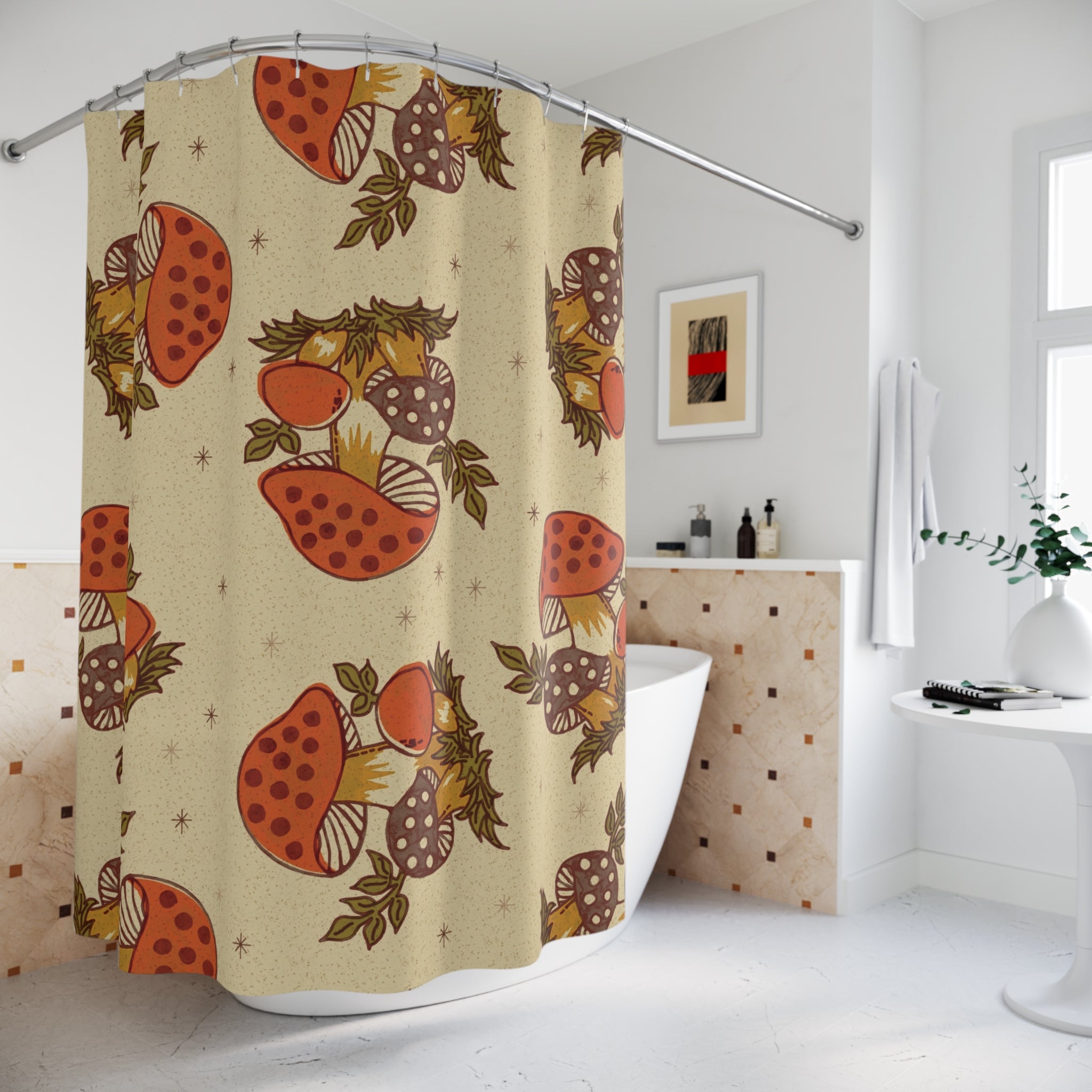 Merry Mushroom Shower Curtain, Retro 70s Bathroom Decor, Mid Century Modern Funky Bath Curtain