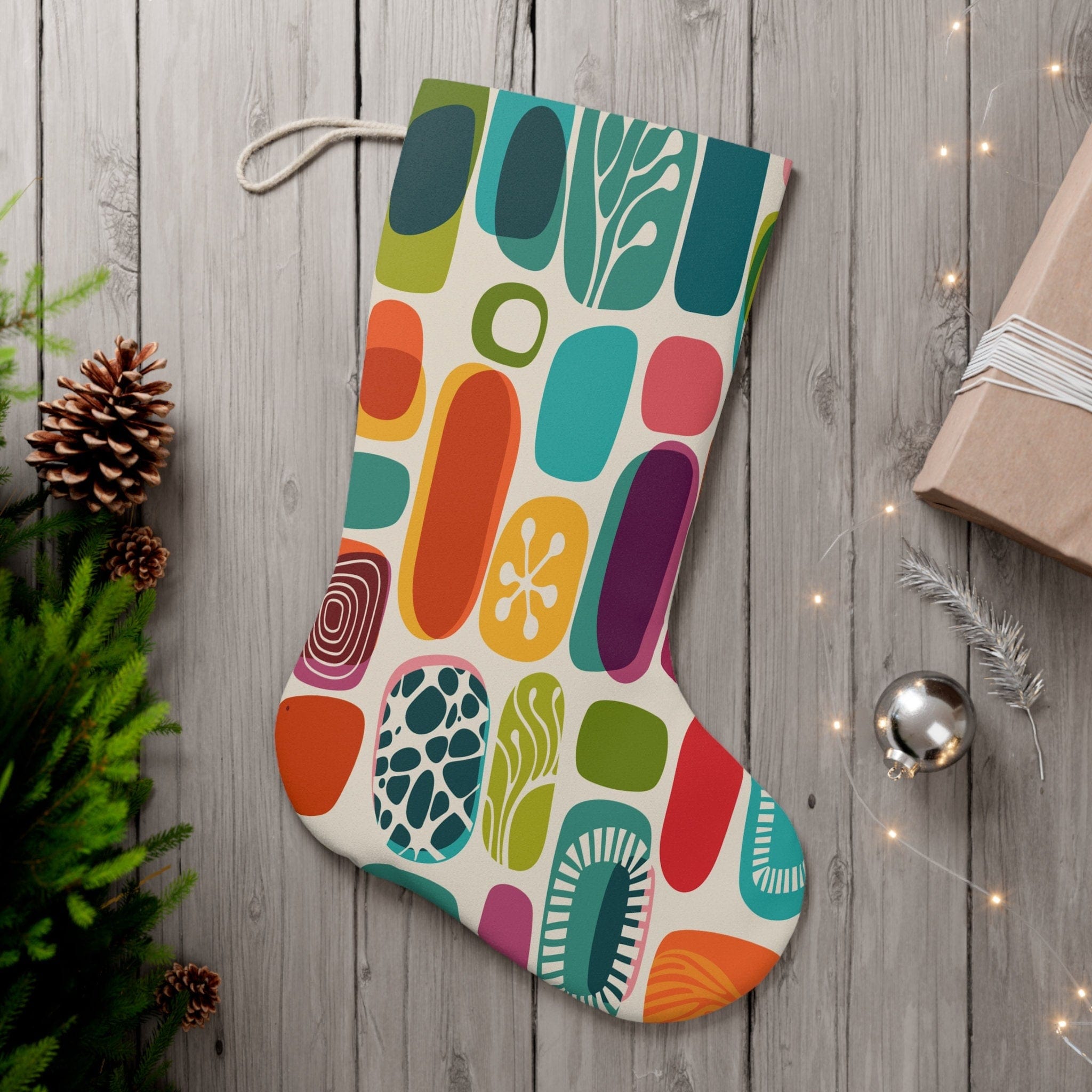 Deck your mantel with these atomic age Christmas stockings! The midcentury amoeba pattern in mod geometric shapes adds groovy flair. A stellar retro addition to your Googie-style holiday decor.