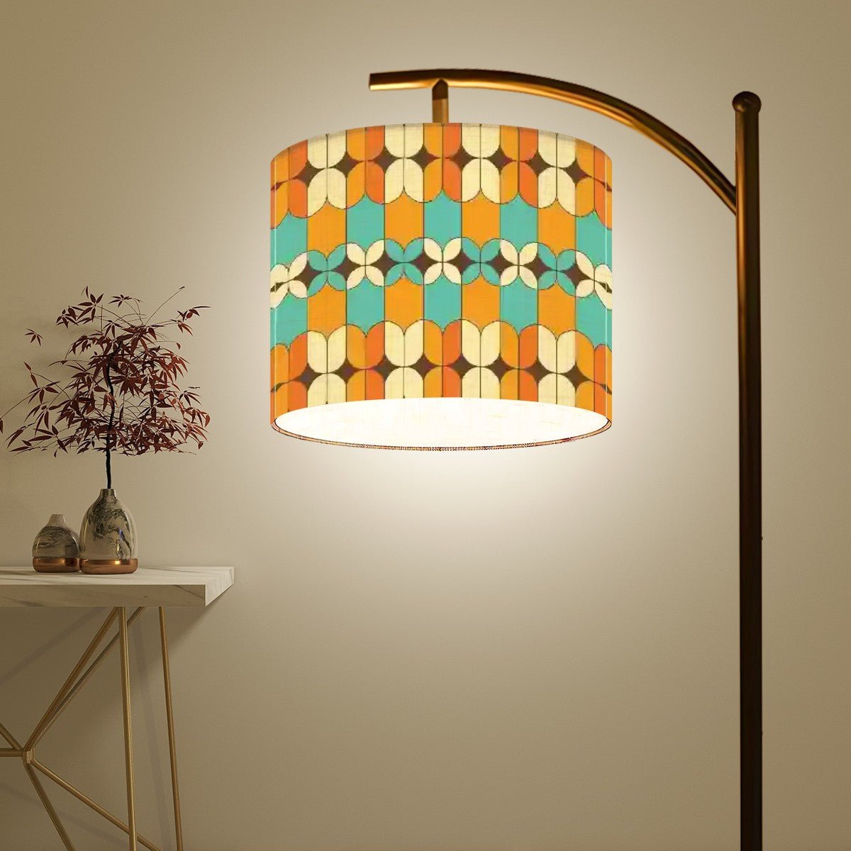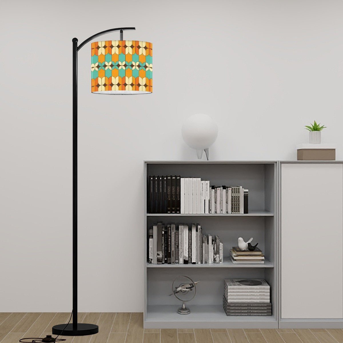 Mid Century Modern Arc Floor Lamp, Retro Geometric Linen Drum Shade in Orange and Aqua, MCM Living Room, Bedroom Accent Lamp