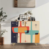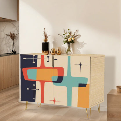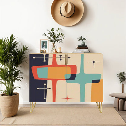 Step into the Atomic Age with this stunning mid-century modern credenza! Featuring a bold starburst and abstract atomic design in warm retro hues, this storage cabinet brings vintage charm with a functional twist. Crafted with sturdy wood and sleek gold hairpin legs, it’s built for both style and durability. Two spacious compartments with adjustable shelving provide versatile storage for your essentials. A timeless statement piece for living rooms, dining areas, or offices—perfect for lovers of 1950s decor.