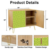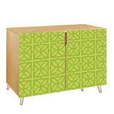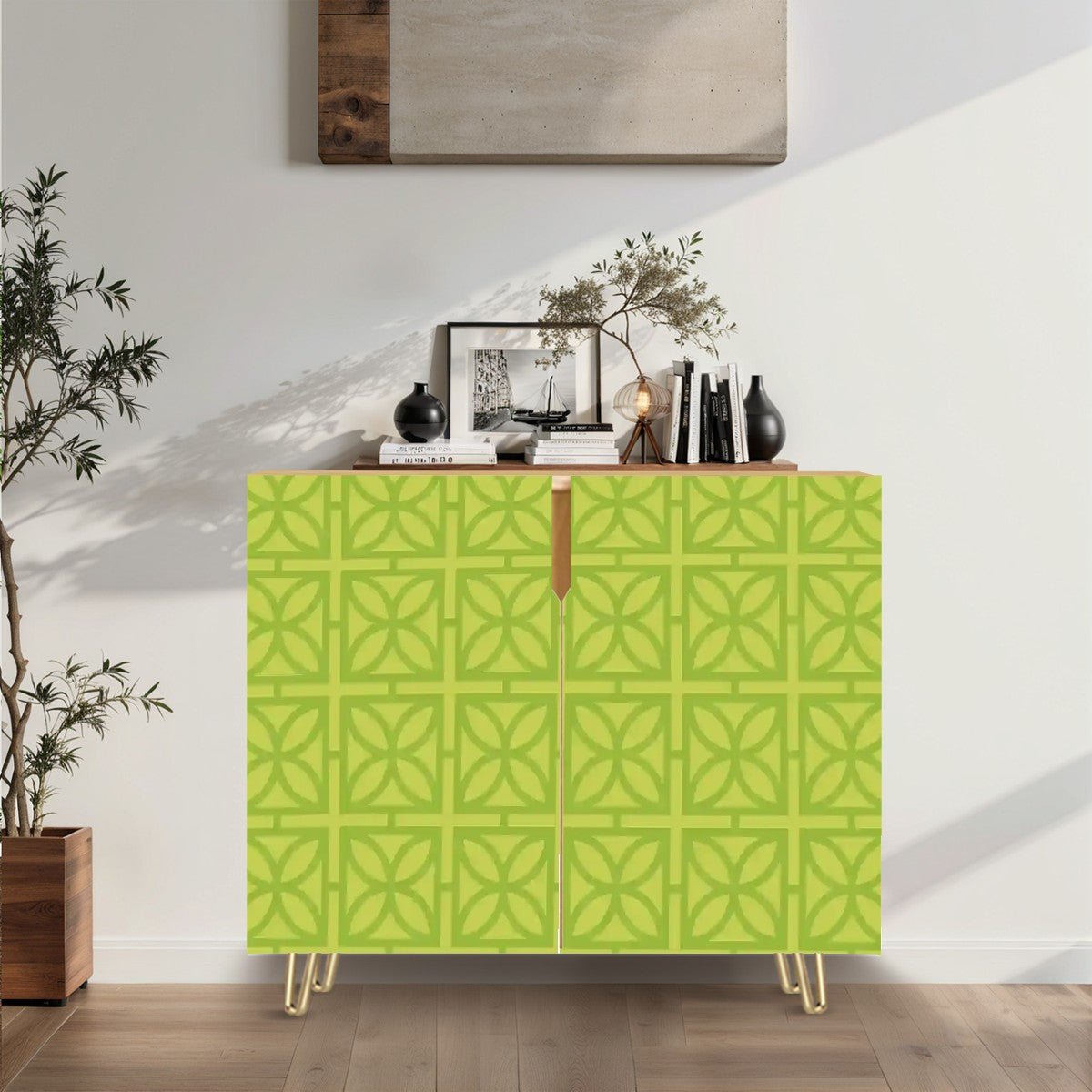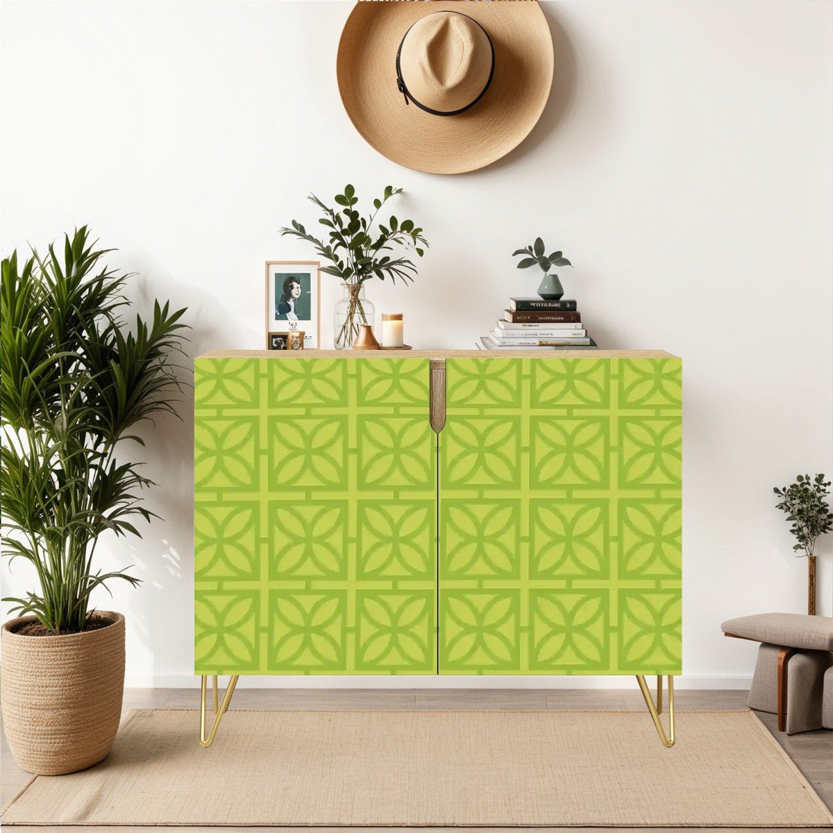 This avocado green mid-century modern storage cabinet features a classic breeze block design, bringing bold retro flair to any space. With sleek hairpin legs and geometric detailing, this stylish wooden cabinet is perfect for adding vintage charm to your home. Ideal for extra storage with a statement look!