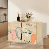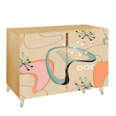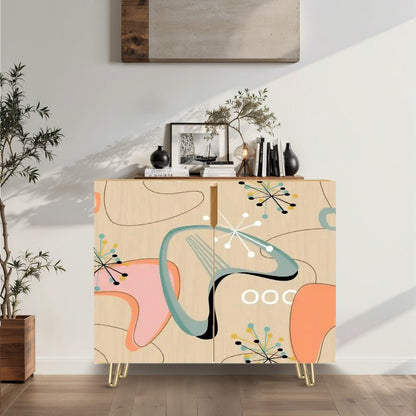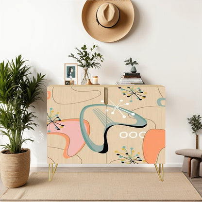 Step back into atomic-era chic with this mid-century modern cabinet featuring bold boomerangs and starbursts in a striking peach, aqua, and black palette. Gold hairpin legs bring sleek retro charm, while the spacious storage makes it both stylish and functional. Perfect for adding a 50s atomic-age vibe to any space!