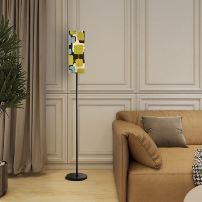 Bring a splash of atomic-era charm to your space with this mid-century modern cylinder floor lamp. Featuring a bold geometric mod squares design in olive green, teal, and brown, this sleek statement piece channels pure 50s retro vibes. The fabric lampshade diffuses light beautifully, while the slim metal base keeps it grounded in minimalist style. Perfect for vintage-inspired living rooms, swanky lounges, or any atomic-age lover’s home.