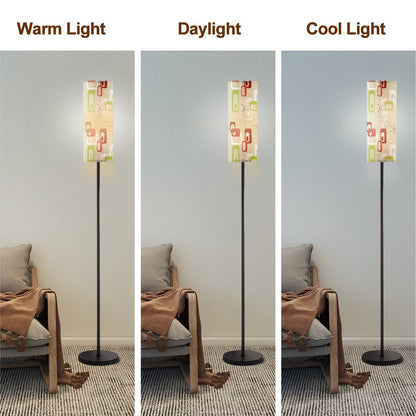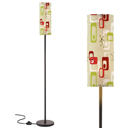 Brighten your space with this mid-century modern floor lamp featuring a retro cylinder shade in a lively atomic geometric pattern. The sleek black stand and timeless design make it a groovy addition to your living room, bedroom, or office. Perfect for lovers of vintage vibes, this lamp adds a sophisticated yet playful touch to your décor.