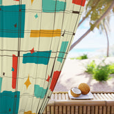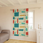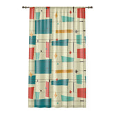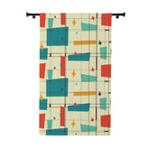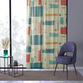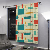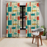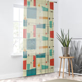 Mid Century Modern Geometric Starburst Pattern Window Curtain, Atomic Squares, Rectangles Curtain Panels, Mid Mod Orange, Aqua, Teal, Cream