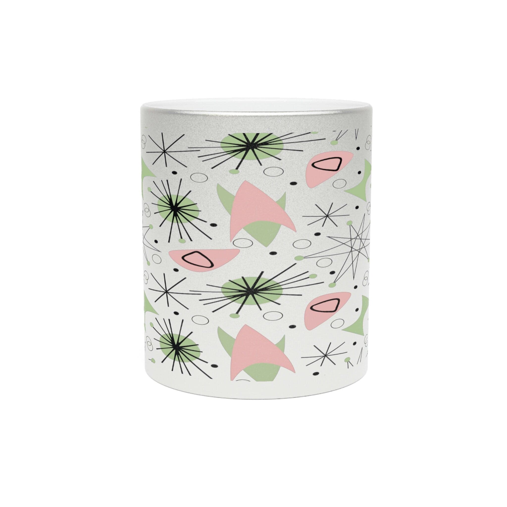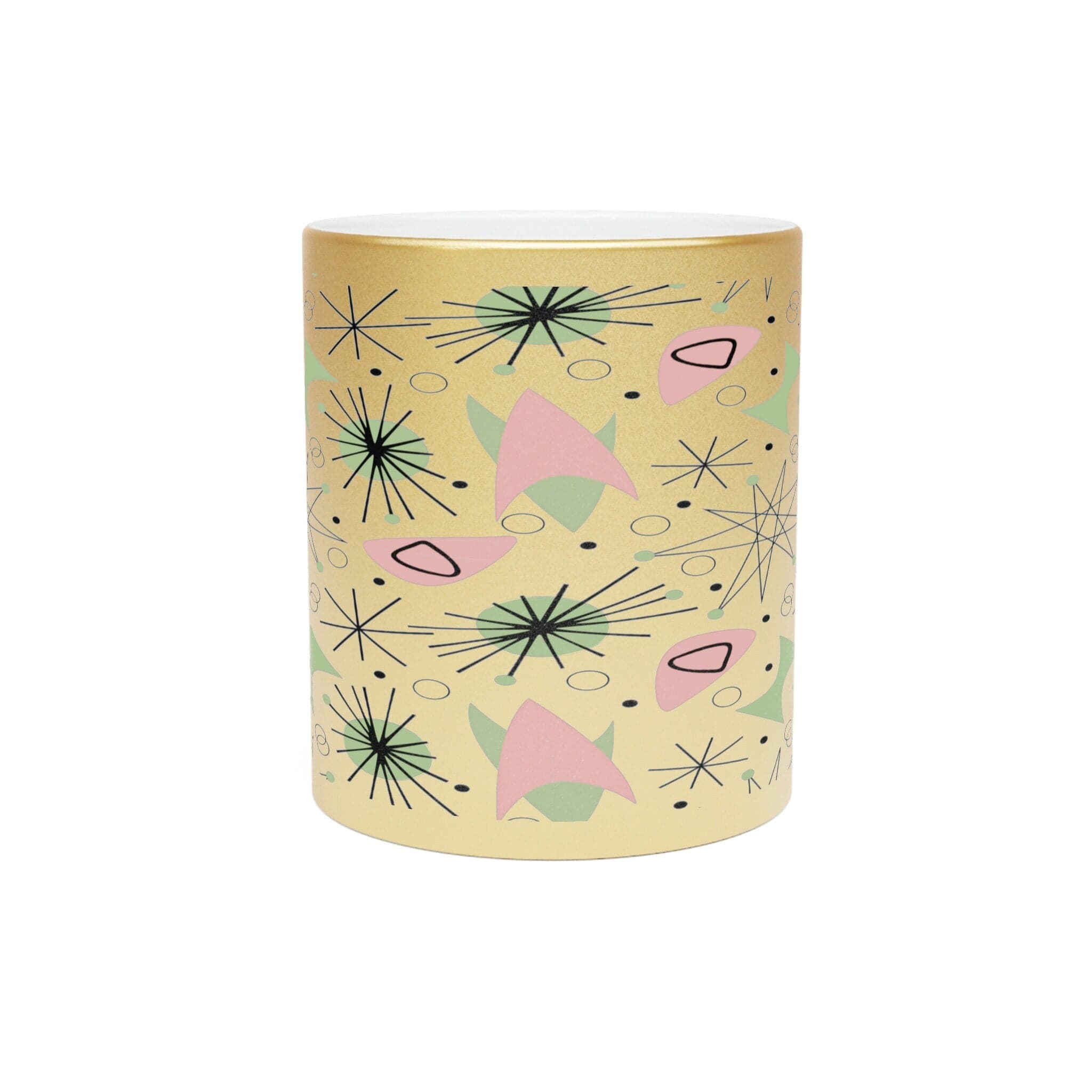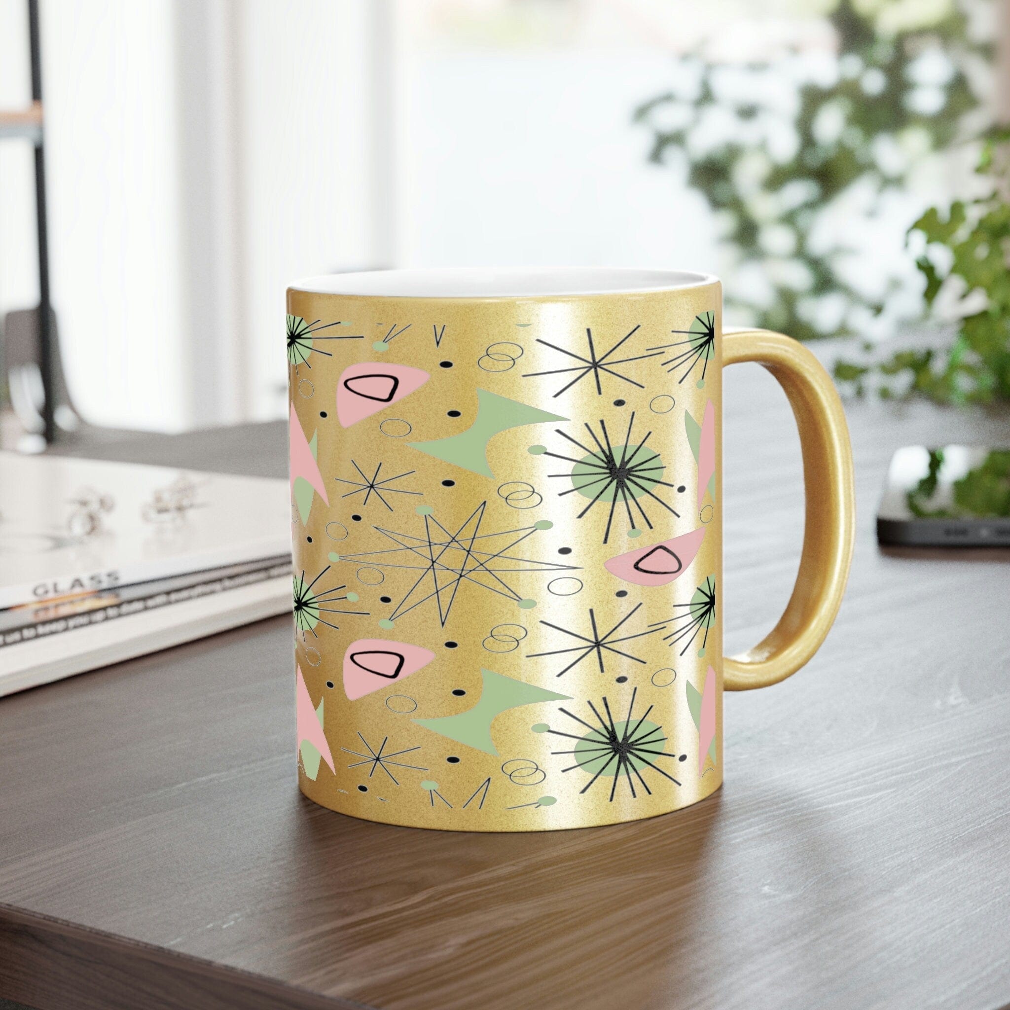 Mid Century Modern Retro Kitsch Starburst Metallic Mug, Pink, Lime Green Atomic Age Accent Coffee Mug, Gold or Silver Mid Mod Drinkware