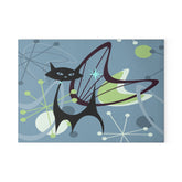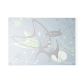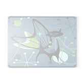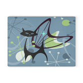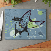 Retro Atomic Black Cat Glass Cutting Board, Mid Century Modern Kitschy Blue, Lime Green Purple Atomic Boomerang Starburst Chopping Board