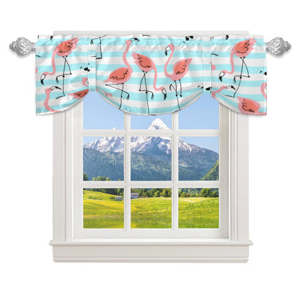Retro Flamingo Tie-Up Valance, Mid Century Modern Tropical Teal Stripe, Fun 50s Pink Kitchen Curtain