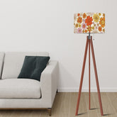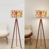 Retro Floral MCM Tripod Floor Lamp, Linen Drum Shade in Orange and Yellow, Mid Century Modern Living Room, Bedroom Accent Lamp