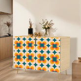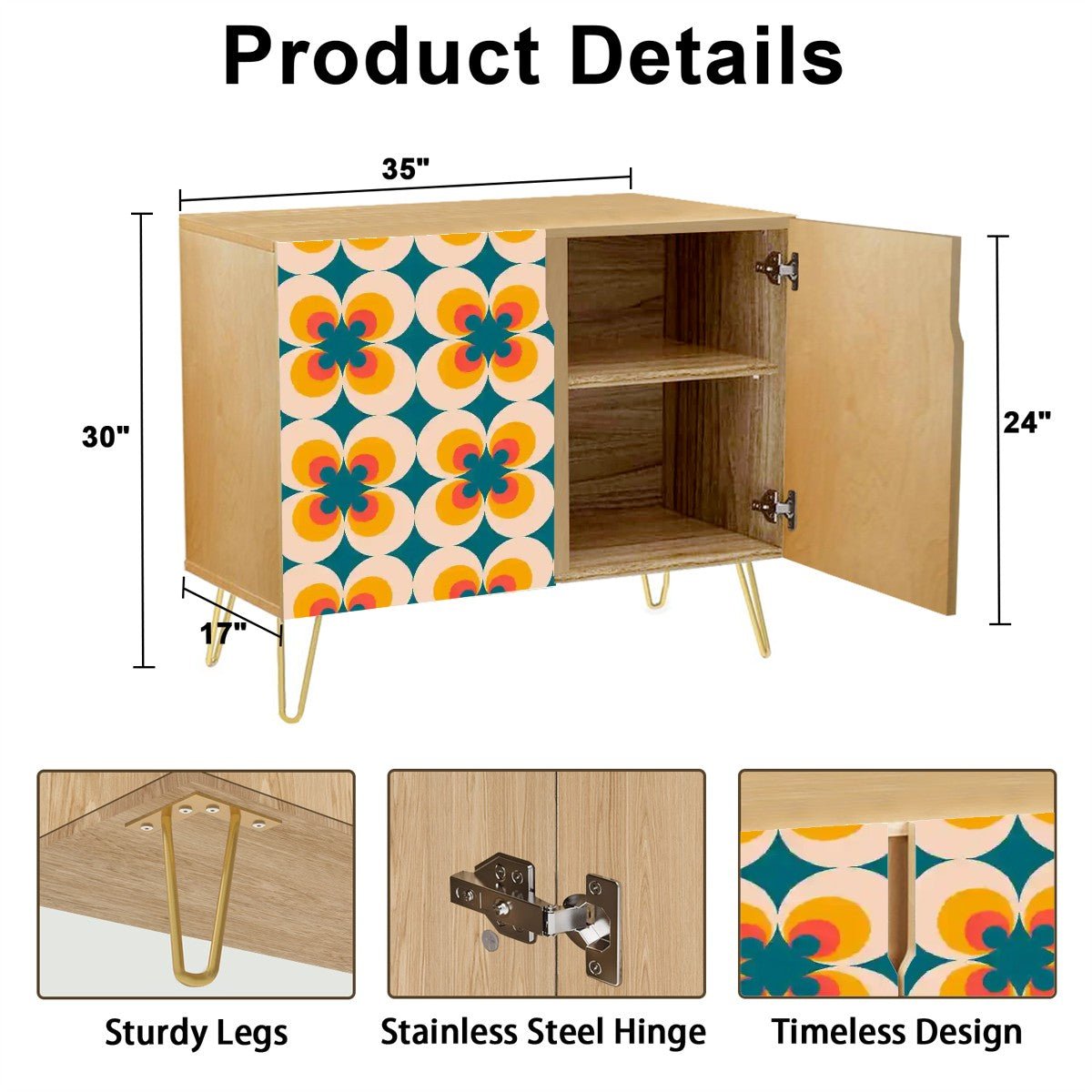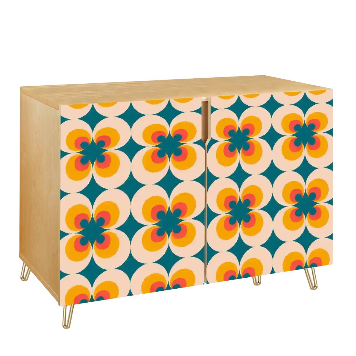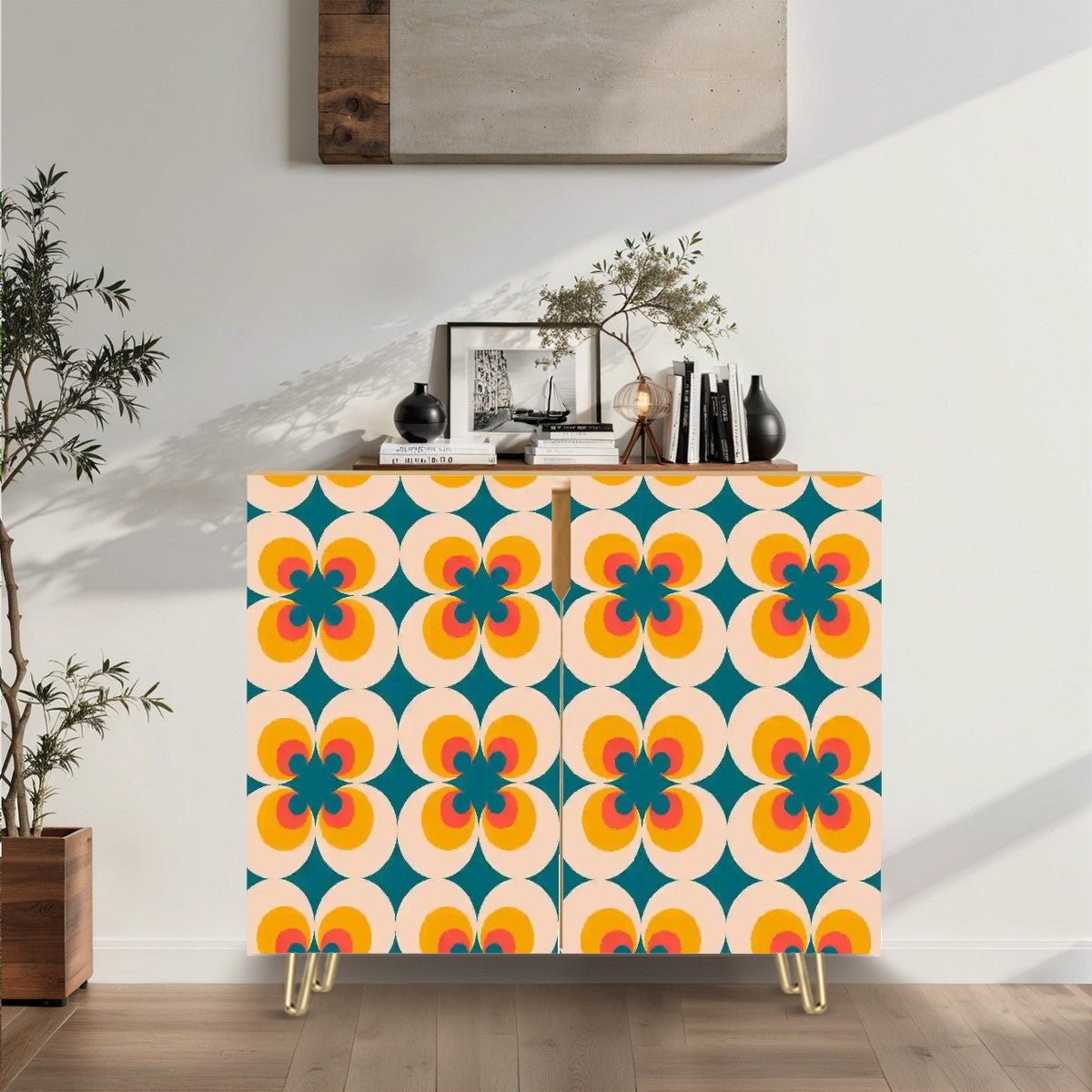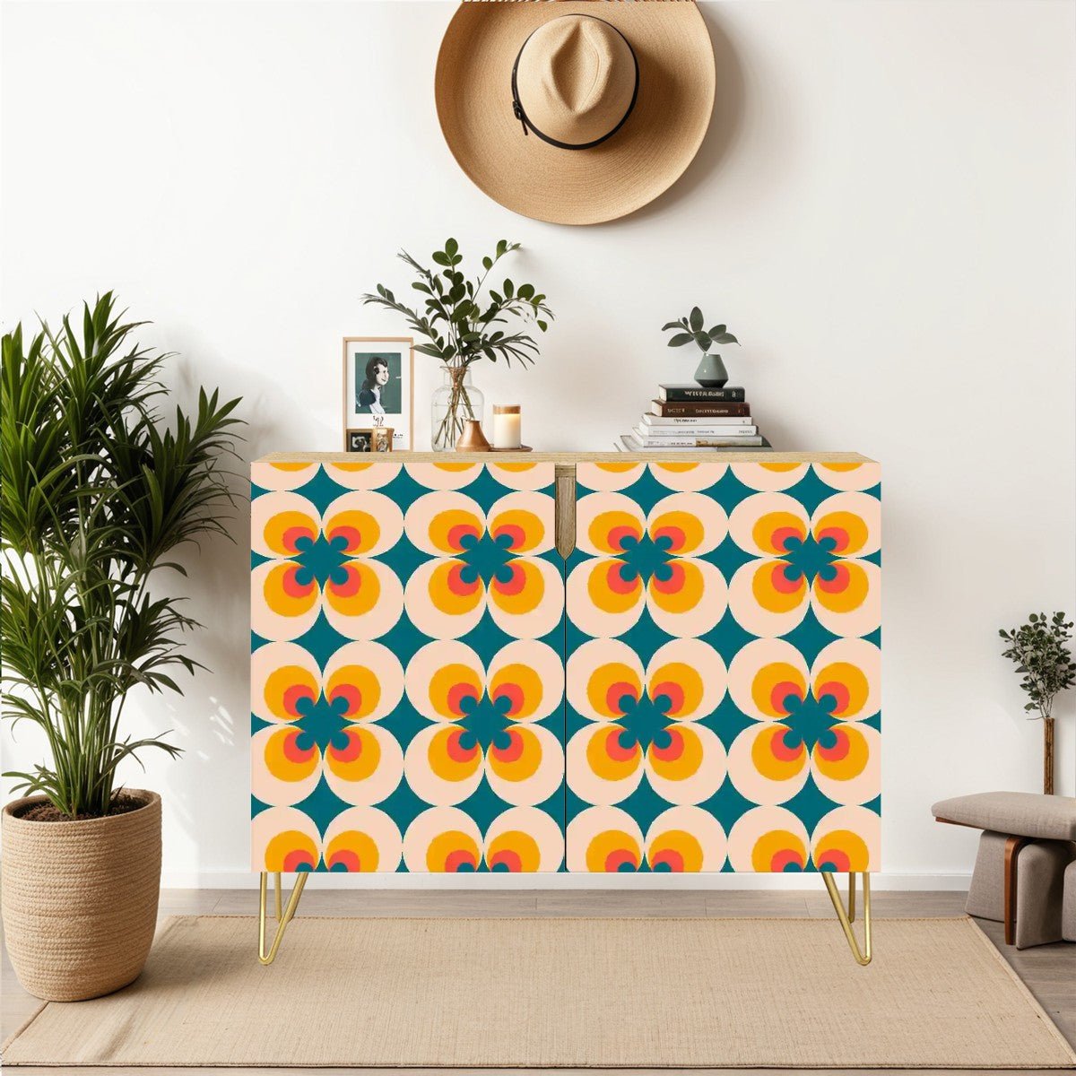 Groovy and bold, this retro mod storage cabinet bursts with 70s flower power! Featuring a vibrant psychedelic floral design in orange, blue, and yellow, this mid-century modern piece adds instant vintage charm. Sleek gold hairpin legs complete the look, making it the perfect accent for a funky, eclectic space. Ideal for storing books, barware, or keepsakes while serving up a blast from the past!