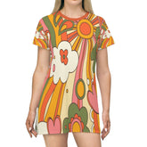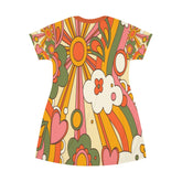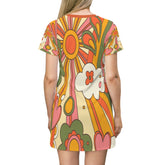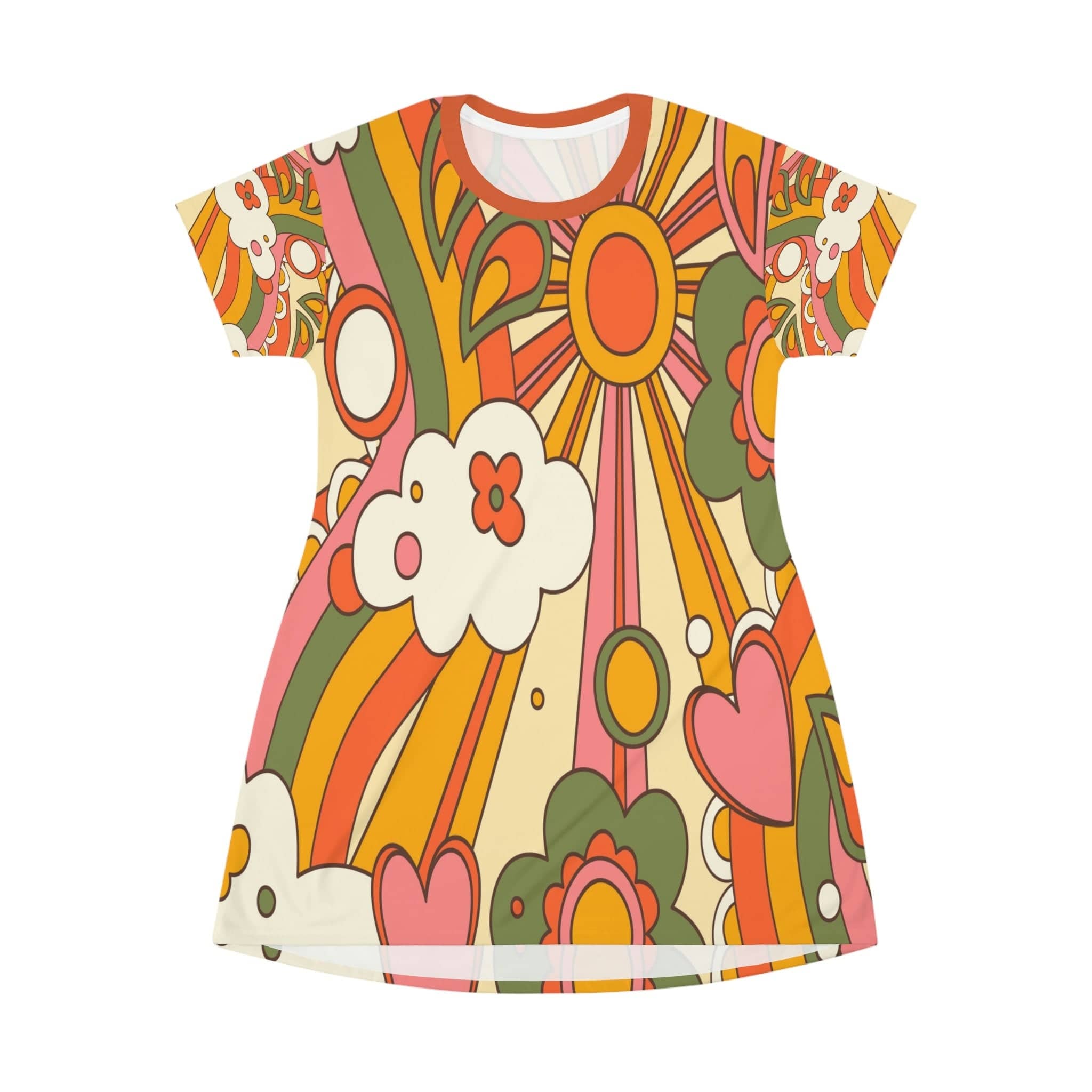 Ready to get Groovy? Stand out from the crowd in this Retro Groovy Hippie 70s Sunburst T-Shirt Dress and transport yourself back to the days of summer lovin' and peace, love, and harmony. The bold summer colors of burnt orange, mustard yellow, and green add a mid century modern feel that will have you looking oh-so chic whether it be for a party or just running errands. Tagless and cut to fit all sizes, this dress is perfect for any age. Plus, with its strong polyester fabric and side seams, this dress retains its shape longer so you can boogie all night. Get ready to disco down memory lane with this must-have Retro Hippie Sunburst Dress!