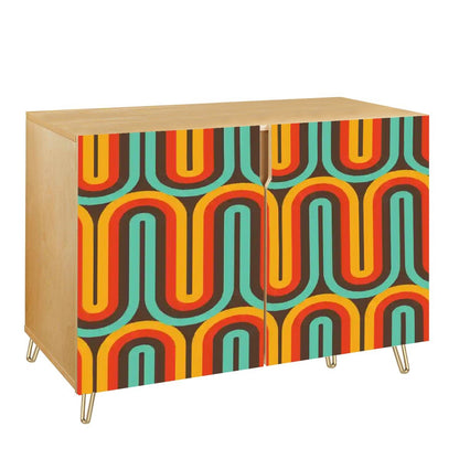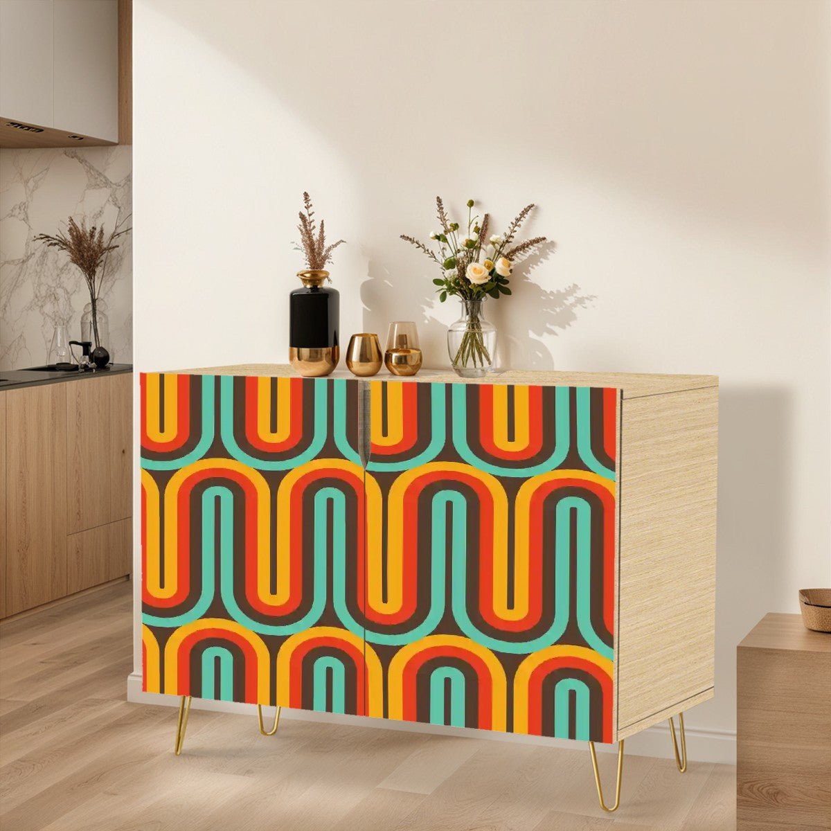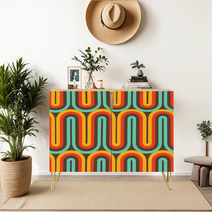 This mid-century modern sideboard brings bold retro charm with a groovy geometric design straight out of the 70s. Featuring a vibrant pattern in orange, yellow, turquoise, and brown, this credenza is a statement piece that adds vintage flair to any space. Built with sturdy construction, sleek gold hairpin legs, and a smooth, easy-open cabinet design, it's both functional and stylish. Whether used for extra storage in your living room, dining area, or home office, this piece channels pure mid-century magic with a contemporary twist.