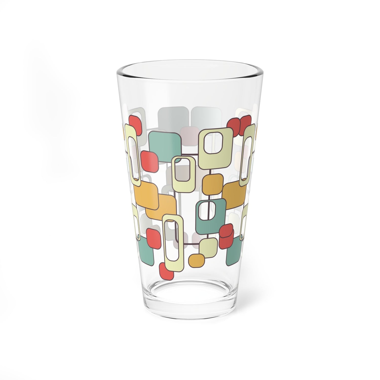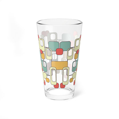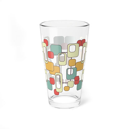 Step up your cocktail game with this retro mod pint glass featuring a bold geometric design in warm 60s-inspired hues. Perfect for mid-century modern barware lovers, this glass adds a touch of vintage charm to any drink. Whether you're sipping a classic cocktail or an ice-cold brew, this sturdy glassware is a stylish must-have for your home bar.