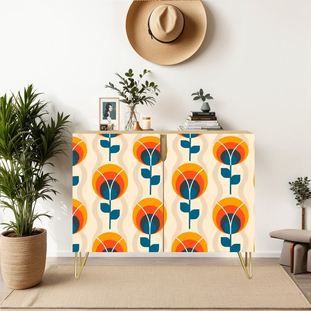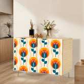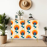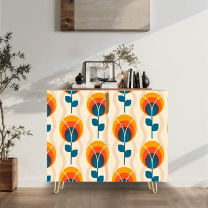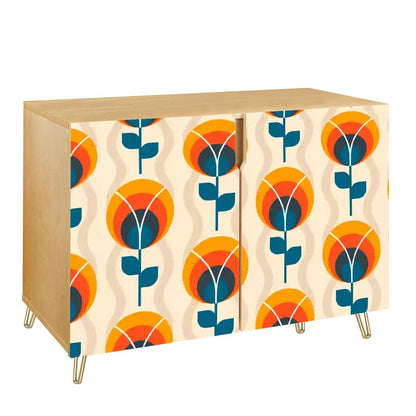 Bring bold mid-century modern vibes into your space with this retro mod floral cabinet. Featuring a striking Scandinavian-inspired floral pattern in warm orange, deep teal, and cream hues, this credenza makes a statement while offering functional storage. Crafted with sturdy wood and accented with sleek gold hairpin legs, it’s perfect for organizing your essentials in style. Ideal for living rooms, dining areas, or offices, this timeless piece blends vintage charm with modern practicality.