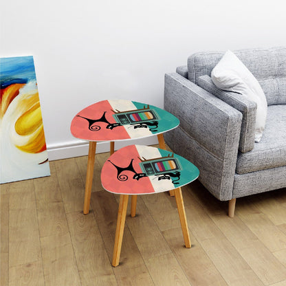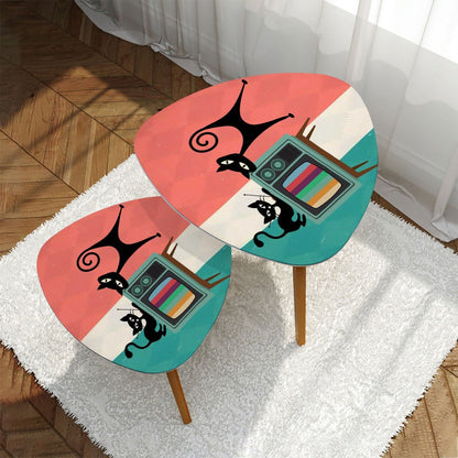 Elevate your living space with these Retro TV Atomic Cat Nesting Tables, a charming blend of mid-century modern aesthetics and playful nostalgia. Featuring a whimsical design with atomic cats and a vintage TV set against bold colors, this nesting table set is perfect for adding character to your living room or lounge. Functional and stylish, these tables nest seamlessly to save space while making a statement. Crafted with durable materials and sleek bamboo legs, they’re ideal for retro enthusiasts and modernists alike.