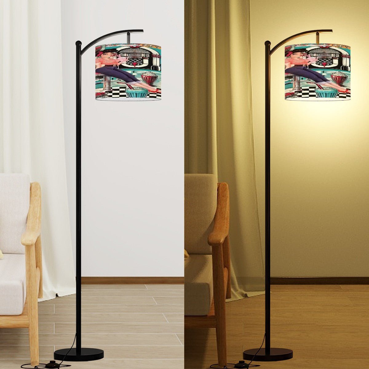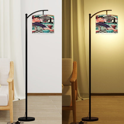 Turn up the nostalgia with this Rockin’ Retro Diner Arc Floor Lamp! Featuring a vibrant soda fountain scene complete with a classic pin-up girl, jukebox vibes, and 50s diner details, this lamp is the ultimate throwback accent. Perfect for adding a splash of personality to your living room, bedroom, or office, it brings the era of milkshakes and rock ‘n roll to life. With its bold arc design and sturdy build, it’s both fun and functional. A must-have for fans of mid-century modern kitsch!