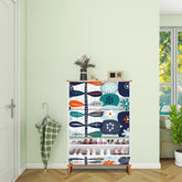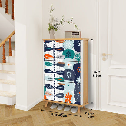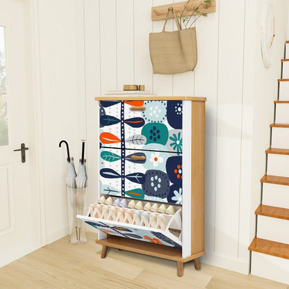 Elevate your space with this Scandinavian-inspired shoe cabinet featuring a vibrant mid-century modern floral design. This sleek organizer combines function and style with its retro color palette, ample storage, and Danish modern charm. Perfect for keeping shoes neatly tucked away while adding a pop of character to your entryway.