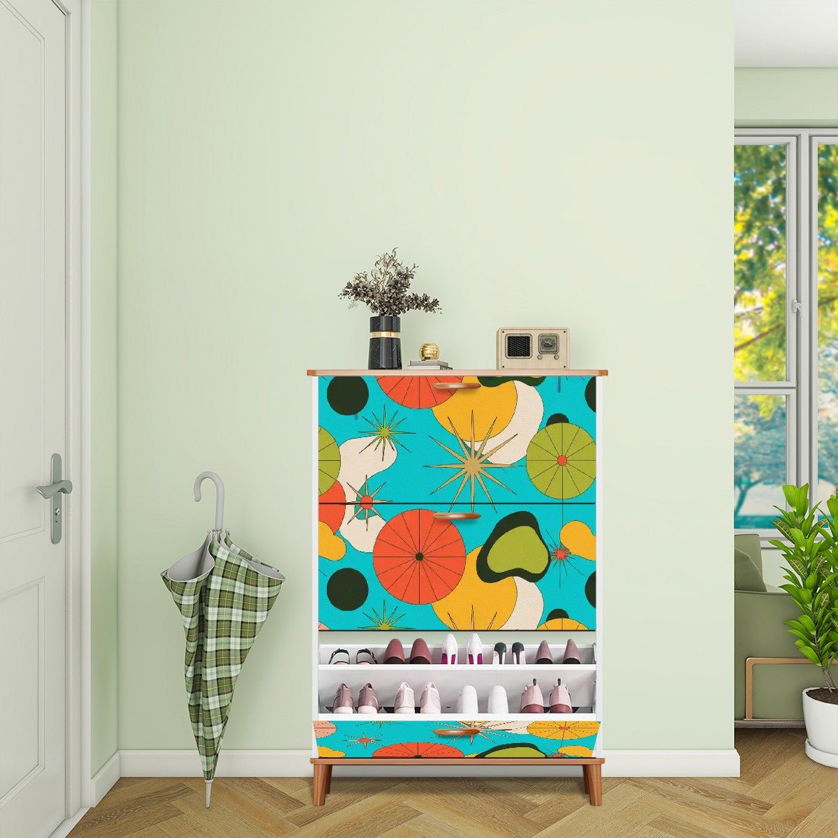 Bring on the boomerangs and orbs! This MCM shoe cabinet serves up serious 50s flair with a bold mix of sunburst accents, abstract orbs, and retro shapes on a turquoise backdrop. Functional entryway storage that's full of vintage sass.