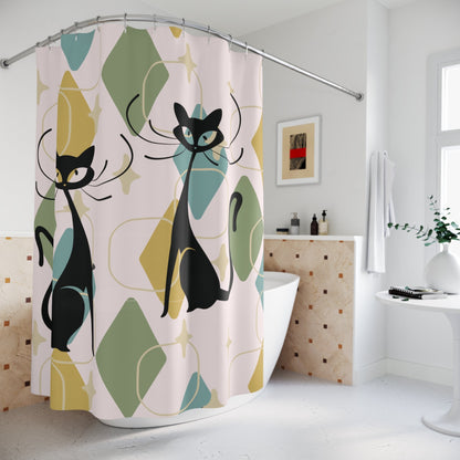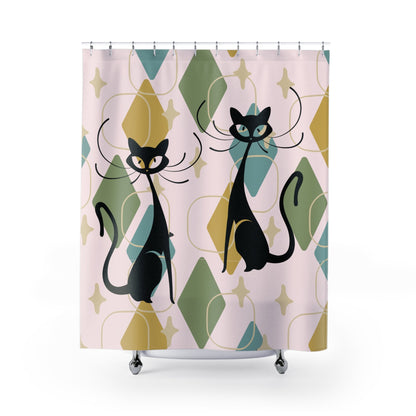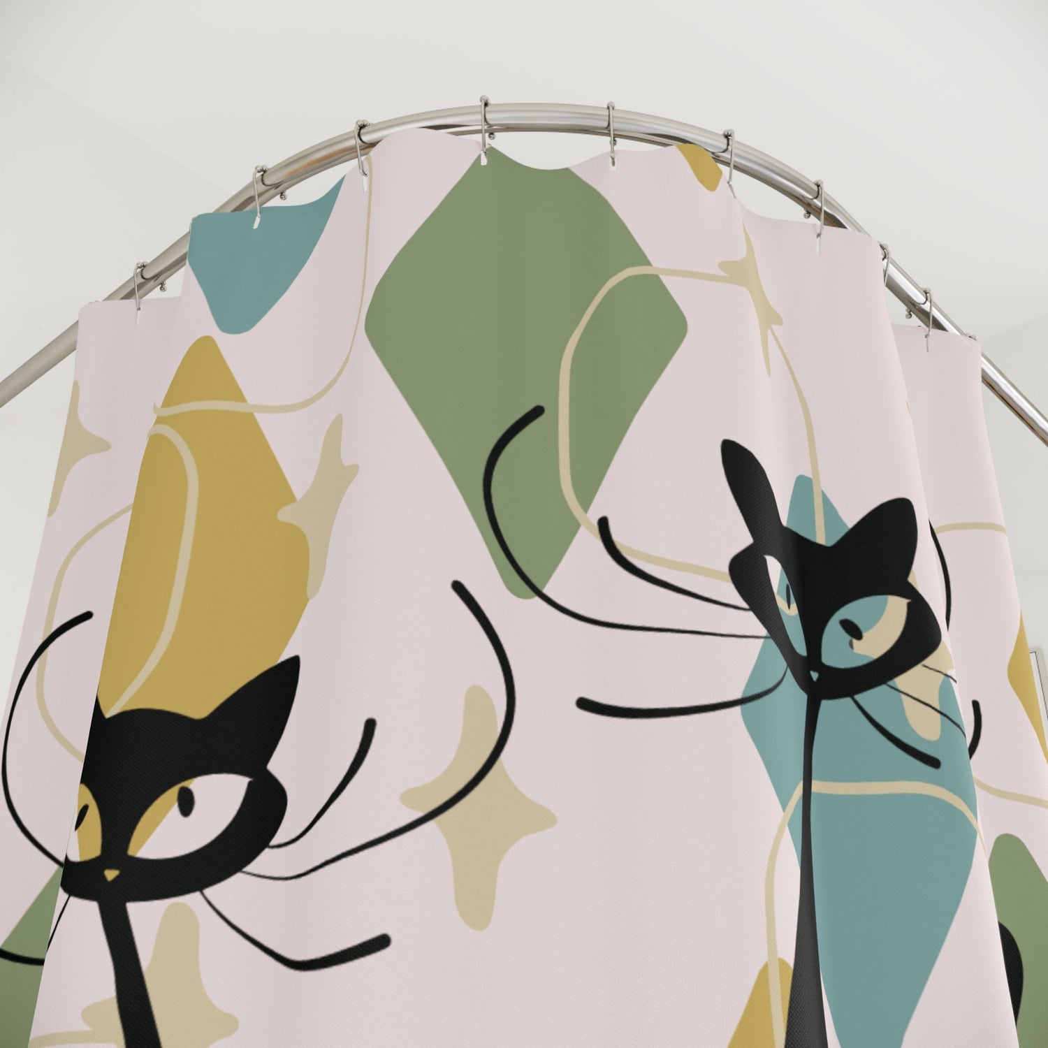 Atomic Cat Mid Century Modern Shower Curtain, Retro 50s Kitsch Bathroom Decor, Geometric Starburst Bath
