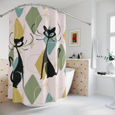 Step into a retro wonderland with this Atomic Cat mid-century modern shower curtain! Featuring a sleek pair of black cats against a dreamy pastel backdrop with atomic starbursts and geometric shapes, this 50s-inspired bathroom decor adds instant MCM charm. Made for those who adore retro kitsch and atomic-age aesthetics.