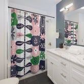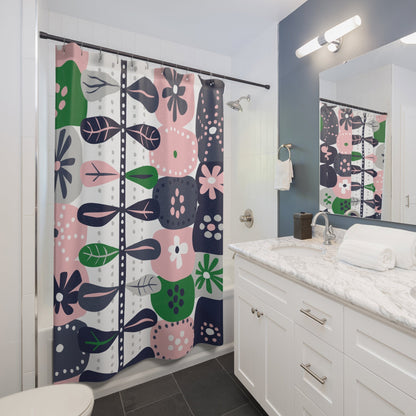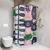 Elevate your bathroom with this bold mid-century modern shower curtain! Featuring a Scandinavian-inspired floral design in deep navy, blush pink, and lively green, this retro botanical print brings vintage charm with a fresh twist. Made for mod lovers who appreciate playful geometric patterns and vibrant color palettes.
