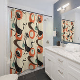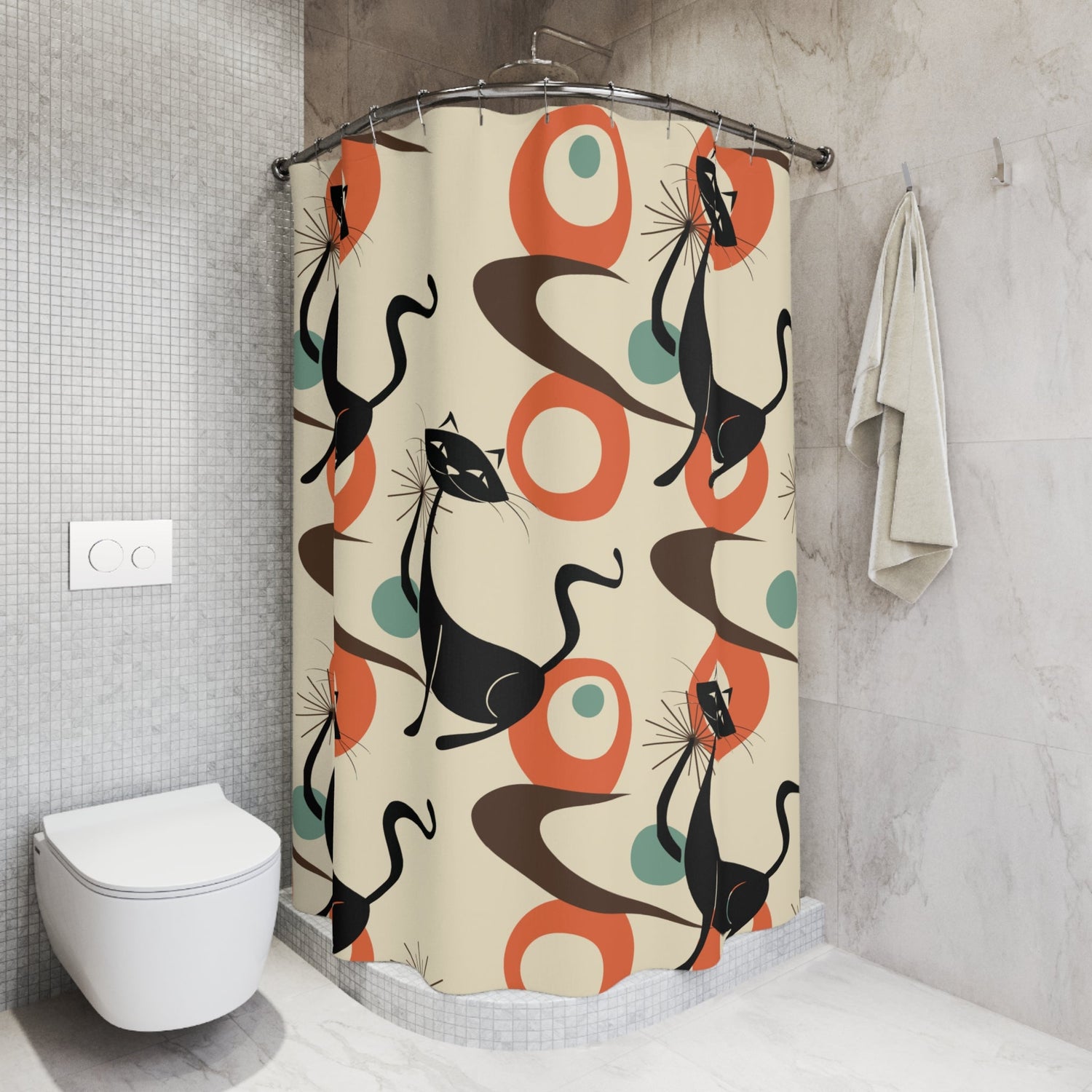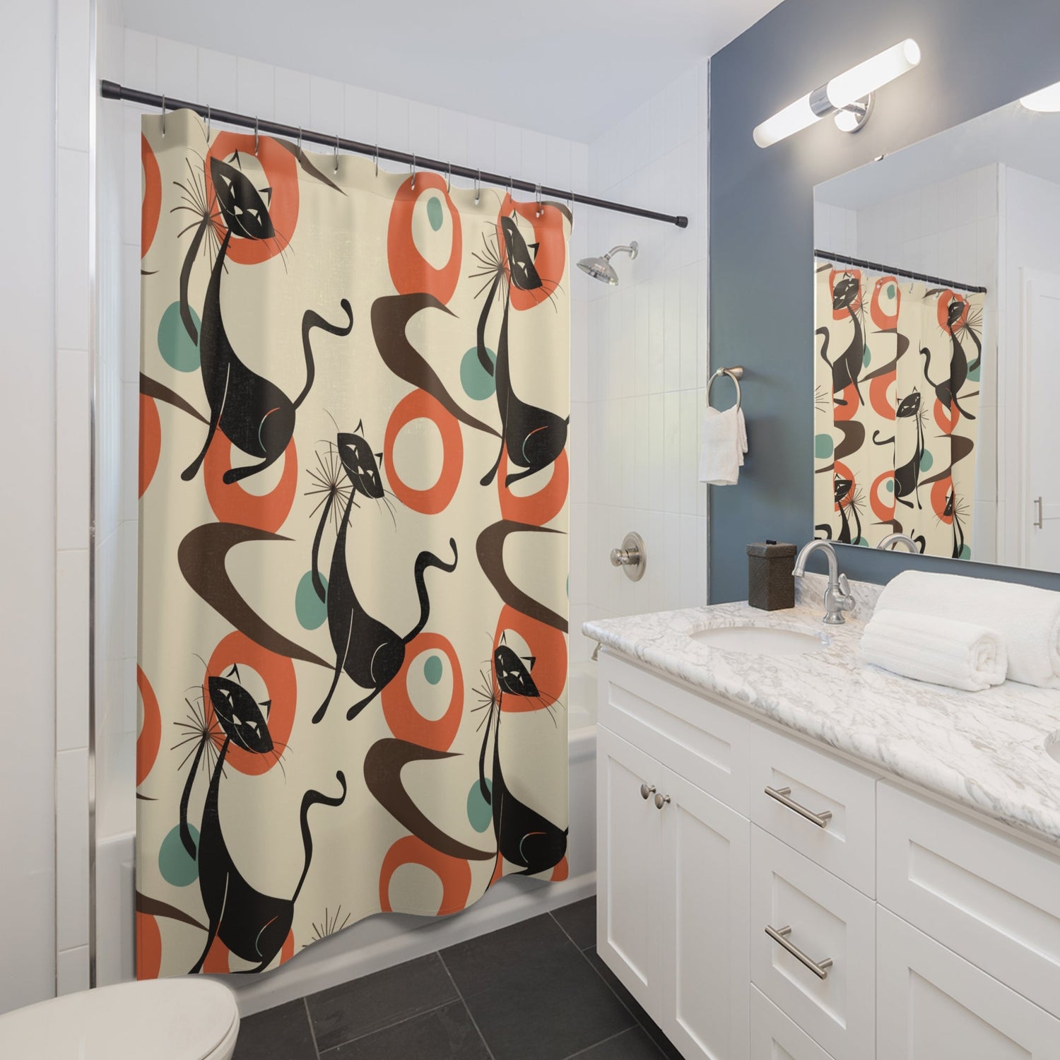 Atomic Cat Mid Century Modern Shower Curtain, Retro Geometric 50s Kitsch Bathroom Decor